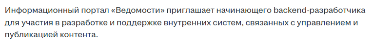 >>3258447 Эта вакансия уже как минимум год висит) Мои петы глянули и сказали, что, мол, извините)))))