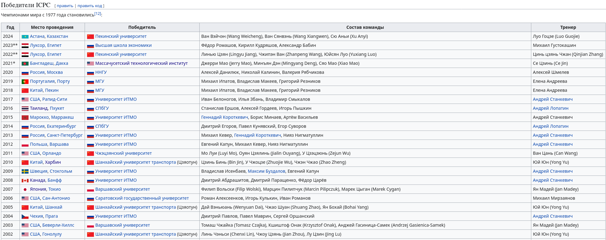 >>3362793 >Этот удобный скрин с чемпионами от 2002 года А теперь давай посмотрим победителей за все время соревнований. Бегом на перекрытие неудобной информации. Кстати, сразу усложню тебе задачу, и СССР, и Россия в то время вполне принимали участие в международных олимпиадах.