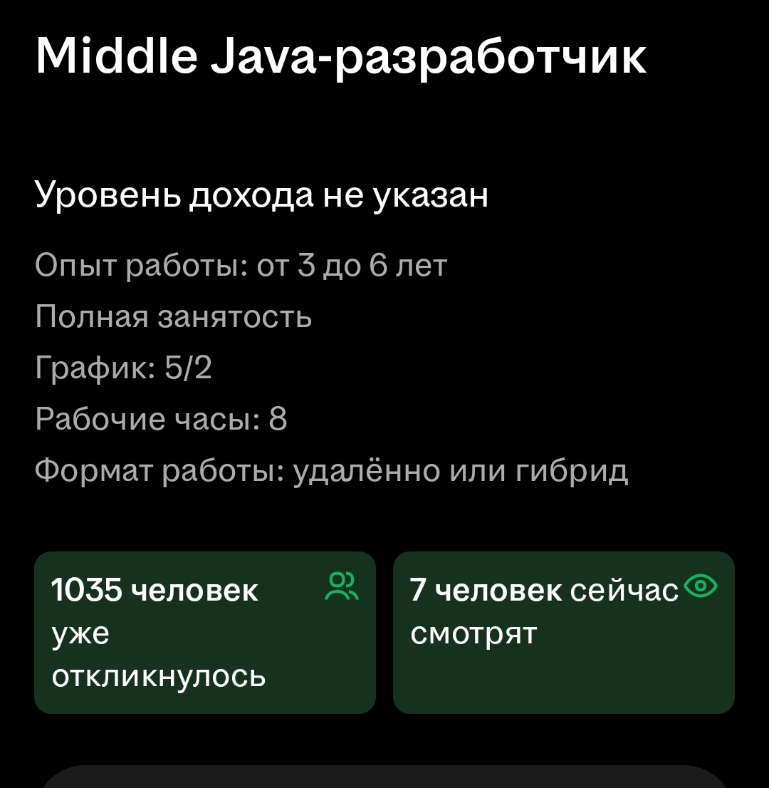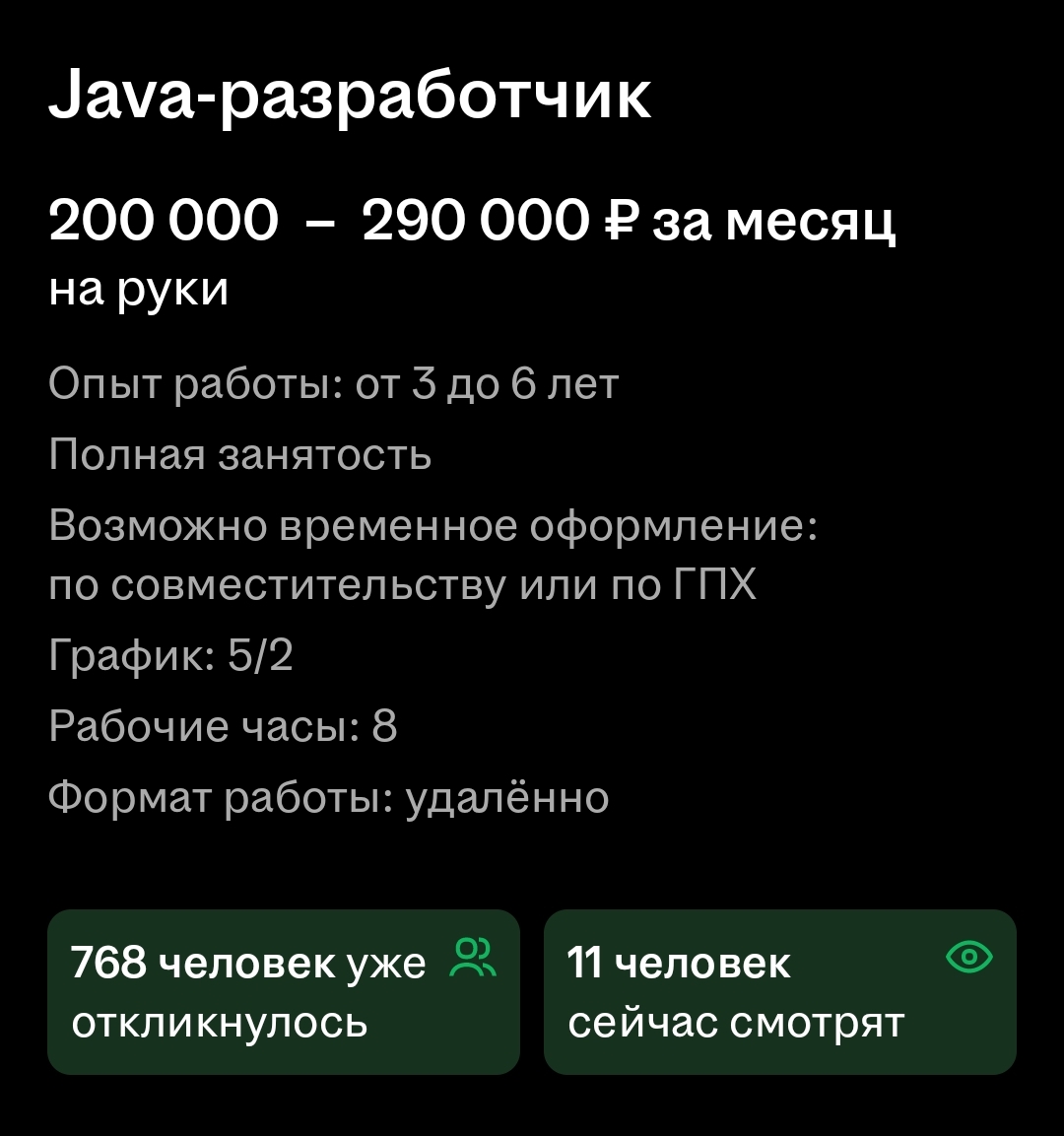 >Про то что придётся быть джуном на подсосе за 80к в курсе Опять ты мыслишь этими категориями. Я объясню на простом примере почему это не работает. Смотри, я допустим хочу купить айфон. Но не за 100 тысяч (потому что у меня нет денег), говорю, а давай-ка посмотрим айфоны со скидкой 50%! А другие-то что, у них нет глаз, они слепые, тупые или что? Другие люди тоже хотят айфоны со скидками 50%! Естественно, дешевый айфон - это как правило НАЕБАЛОВО. Не бывает чего-то очень хорошего дешевого. Это либо ворованный, либо серый, либо восстановленный айфон. Также и в айти. Не бывает "работы без опыта". Все требуют опыт. А те, кто убирает опыт - это 5-10% вакансий на рынке, они не просто так это делают. Это может быть посредник - рекрутинговая компания например. Она просто поменяла заголовки и получила 10х больше откликов. Туда полгорода откликнулось, и как ты думаешь, допустим из 100 человек какой шанс 1) что откликнется человек с опытом? 2) наймут именно тебя?