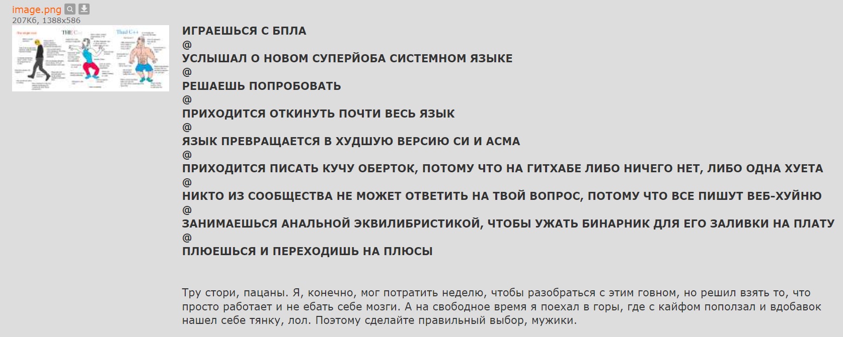В последнее время много Раста приходится читать, всякие демки по последним работам из моей области. Нахожу какую-нибудь работу, где гигачады потрудились, сделали все крута (реально круто) но, будучи небинарными пидарасами, выбрали Раст - открываешь код и просто начинаешь трястись от этого манускрипта Войнича нахуй.