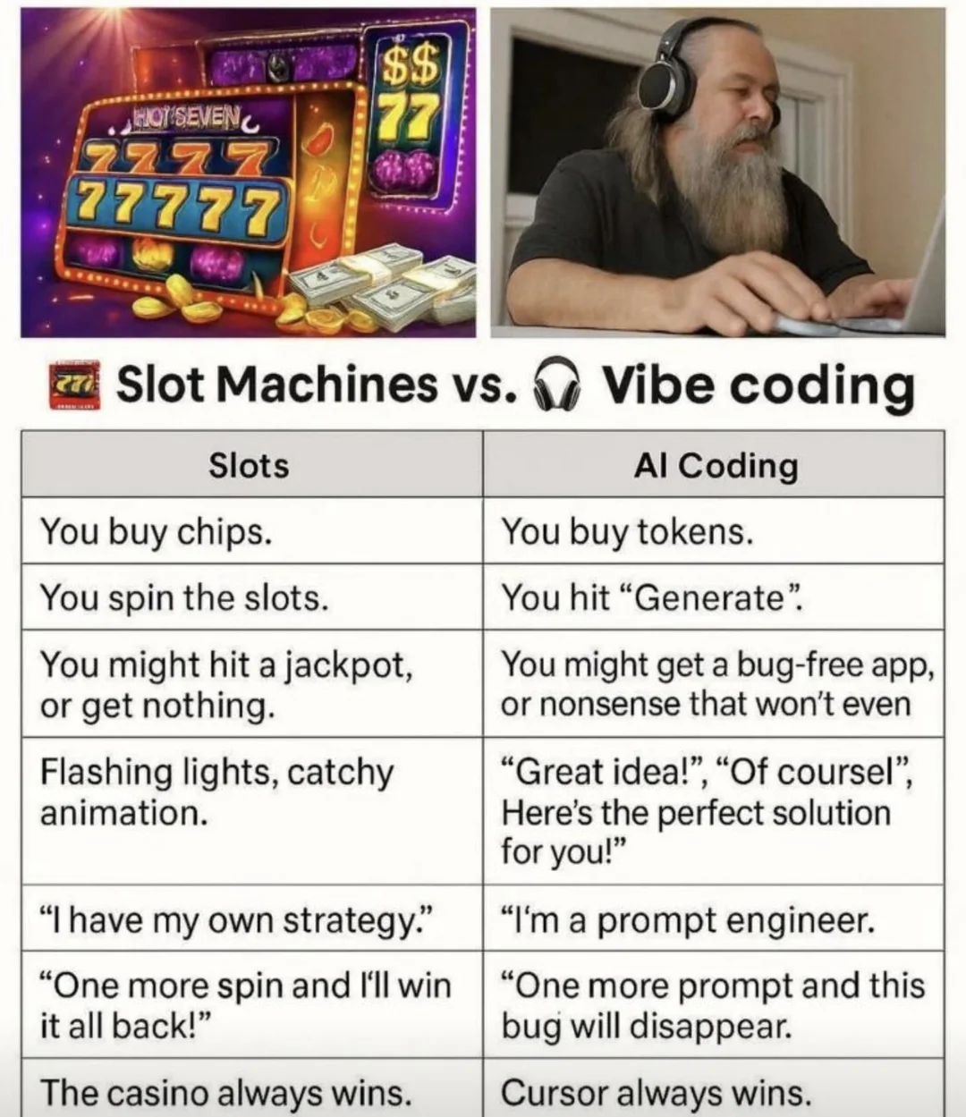 >>3560755 На месте. В целом вайб кодинг у меня реально местами напоминал бросок кубика на удачу или открут слота. Деньги улетают в трубу, а что получишь взамен, остается только догадываться.