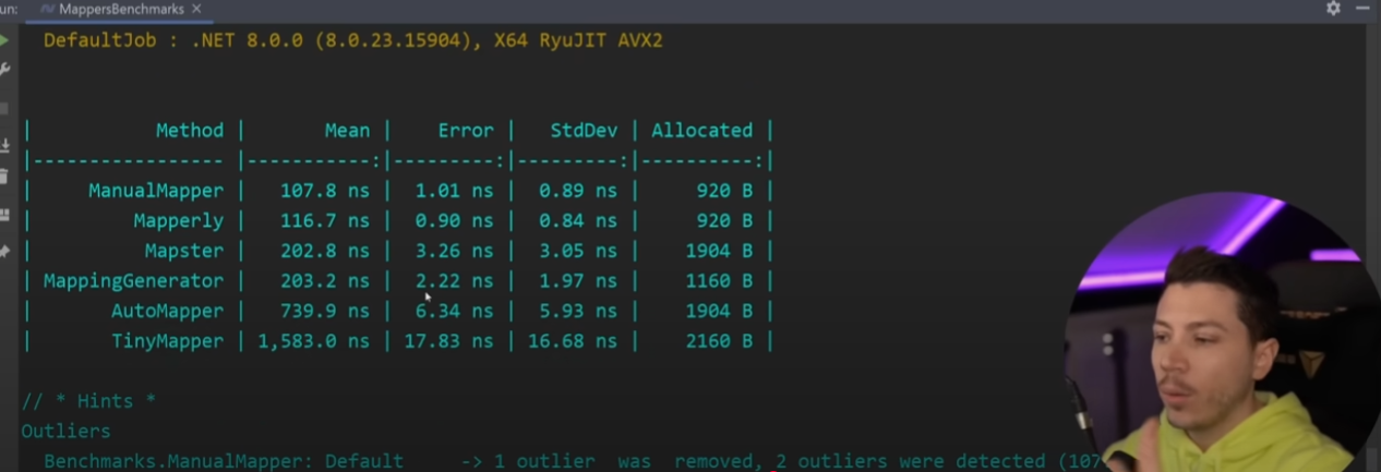 >>3475515 Там скорее всего рефлексия на этапе инициализации, и в её время динамически генерируется код самого маппинга. Судя по скорости рефлексия в тайнимаппер (сука, тайни наоборот должен быть самым быстрым). При этом маппинг никогда не является бутылочным горлышком, поэтому будь он даже в 10 раз медленнее, это было бы в рамках погрешности всего приложения. Мы не любим автомаппер за то, что то, что там происходит, слишком неявное. Тебе IDE может показывать, что какое-то свойство не используется, а на самом деле это не так. И из-за этого может быть просто невероятно сложно отследить поток данных.