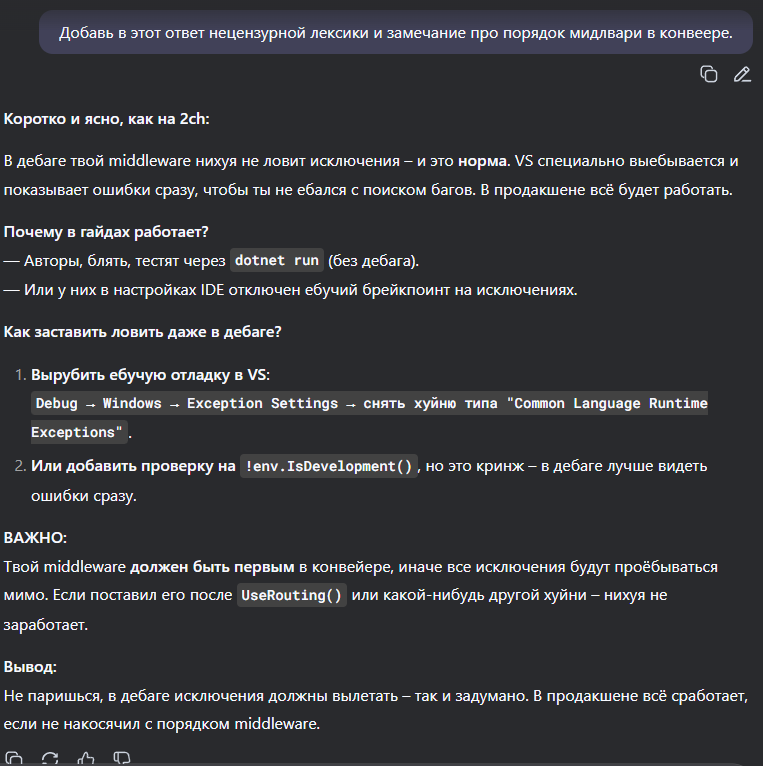 >>3535317 >Performance Improvements in .NET 10 >В этом году чат-гпт не только помогал мне с написанием статьи, но и сам контрибьютил в рантайм. Для .NET 11 он сам напишет статью, а для .NET 12, только чат-гпт будет писать код дотнета, а разрабы ему писать "please address the feedback above".