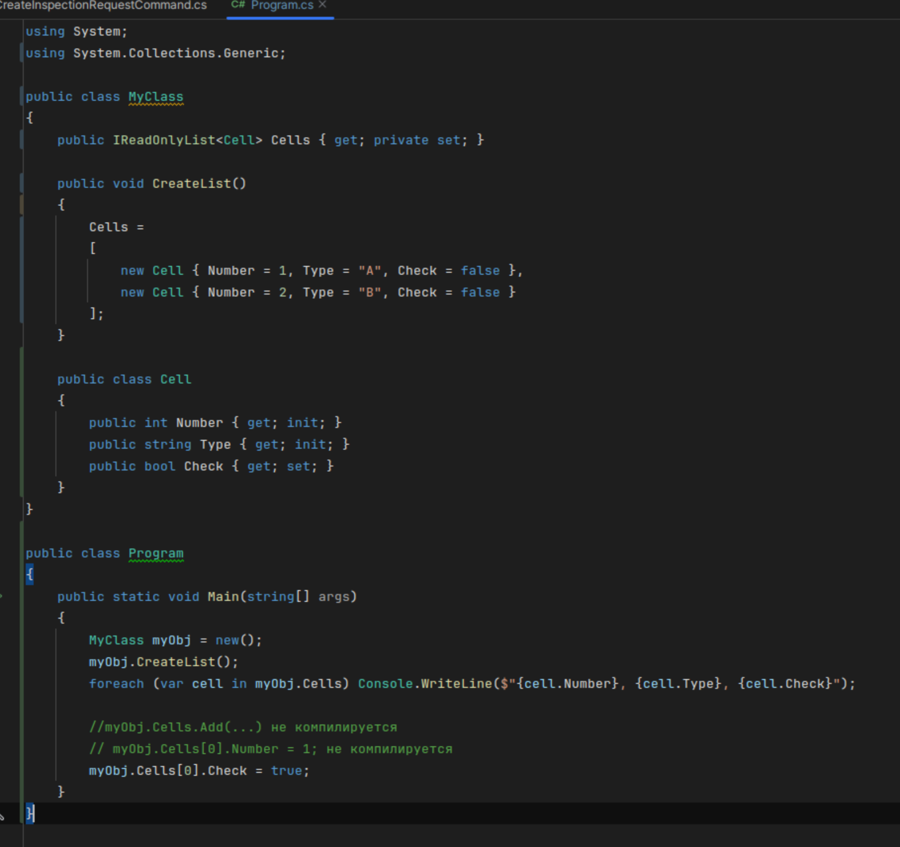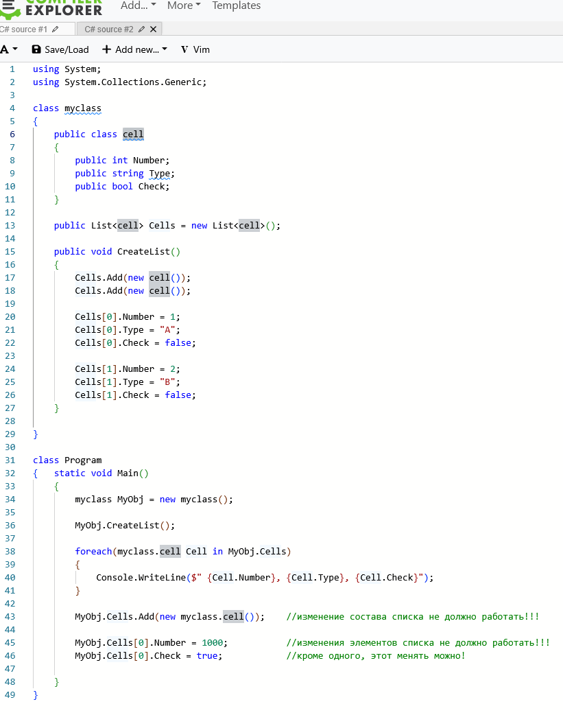 Анонасики, помогите решить задачу. Который день бьюсь никак не могу понять, даже нейросеть пукнула и ничего внятного не сказала. Есть код пикрил. Я пишу класс myclass, в нём создаю список из объектов класса cell. Этот список мене нужно запретить для редактирования из основной программы, сам список и поля элементов запретить, но одно поле должно быть доступно для редактирования. Ни так, ни сяк не получается. Ни как не получается такое сделать.
