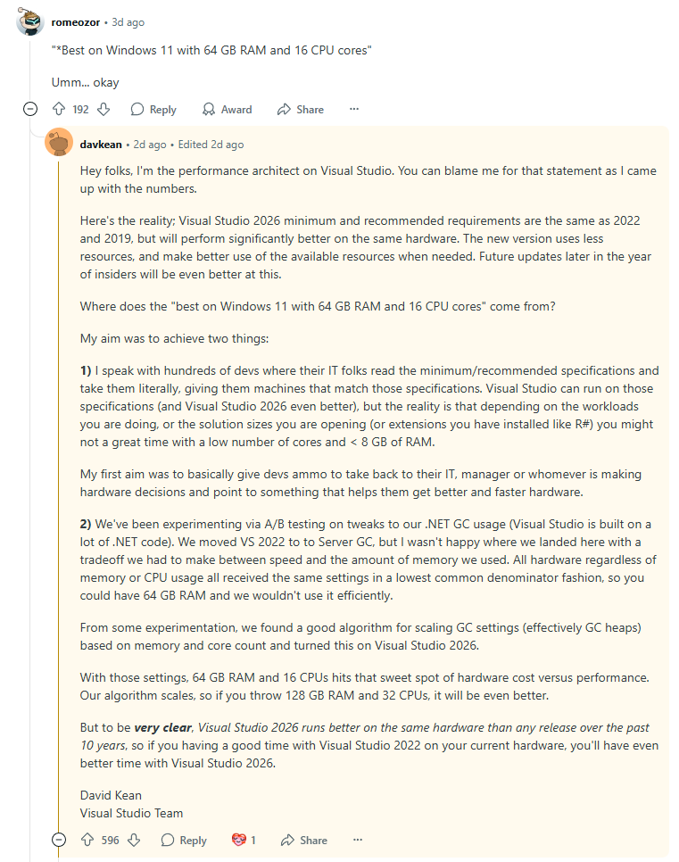 >Here's the reality; Visual Studio 2026 minimum and recommended requirements are the same as 2022 and 2019 Уже пиздёж (в минималках оперативы: VS19 - 2ГБ, VS22/26 - 4ГБ).