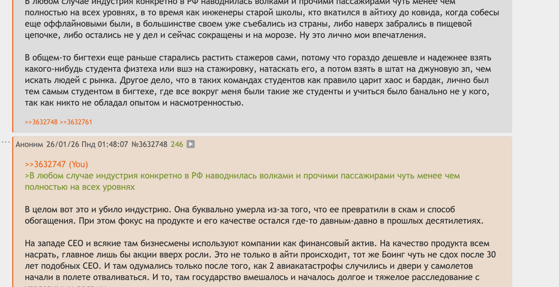 В любом случае индустрия конкретно в РФ наводнилась волками и прочими пассажирами чуть менее чем полностью на всех уровнях, в то время как инженеры старой школы, кто вкатился в айтиху до ковида, когда собесы еще оффлайновыми были, в большинстве своем уже съебались из страны, либо наверх забрались в пищевой цепочке, либо остались не у дел и сейчас сокращены и на морозе. Ну это лично мои впечатления.