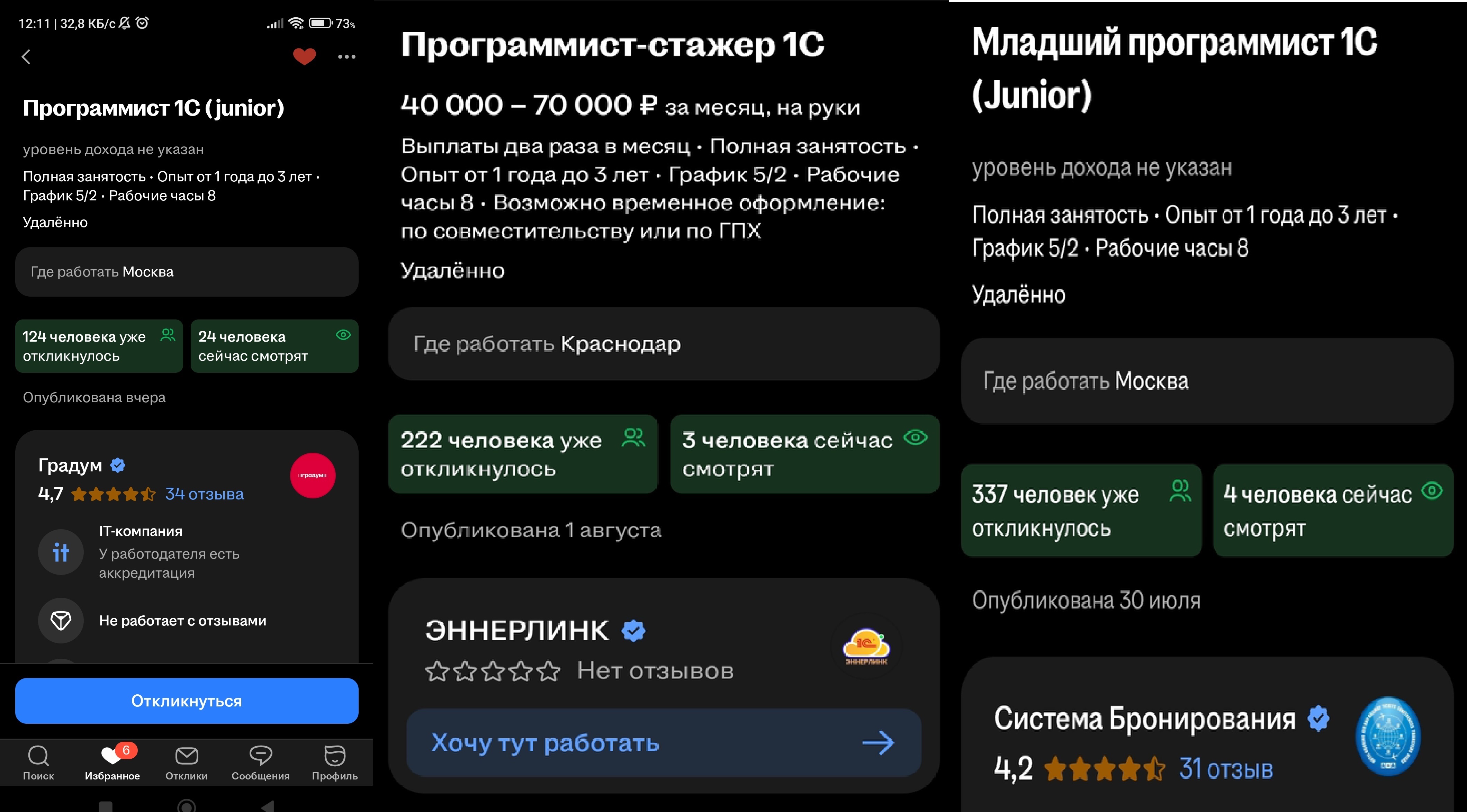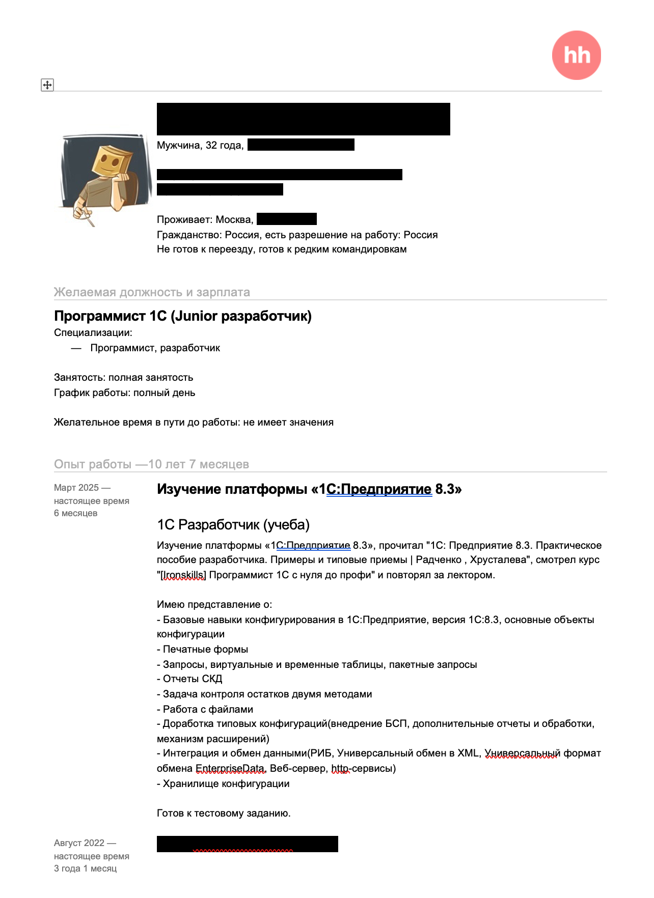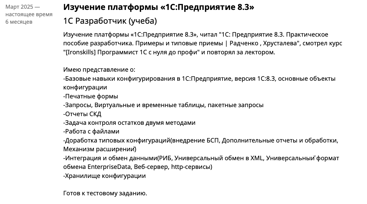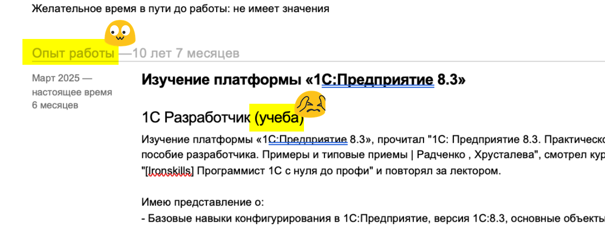 Что скажете? Грамотный анализ рынка? Мне кажется, я создан быть аналитиком. А ведь потом получив запись в трудовой "Аналитик", я смог в будующем легко трактовать это как: Data Analyst, продуктовый аналитик, бизнес-аналитик, системный аналитик. То есть перекат из 1С в другую область легчайший, надо лишь получить харды каким-то образом, а запись в трудовой уже будет.