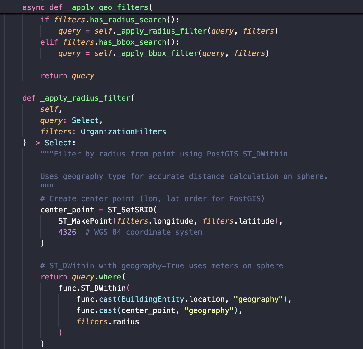 я не стал демонстрировать свои знания геометрии и плюс я дето слышал, что есть специальный тип хранения этой фигни в бд. Соответственно использовал postGIS. Внутри модуля объектов два доп файла: geo_helpers: для создания точки и извлечения буду юзать при гете или создании, тк отображать/получать буду только широту и долготу
