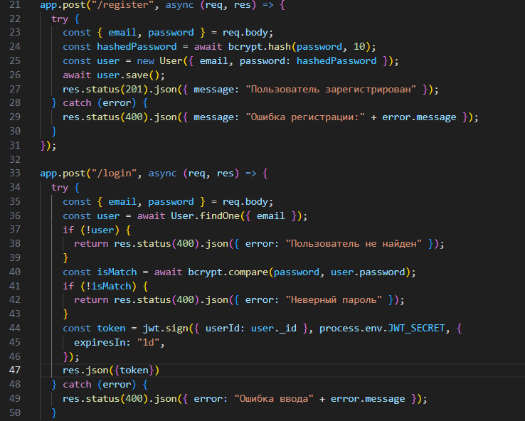 >>3521679 А что ты хотел написать? Если в твоей программе два эндпойнта и это всё что она должна делать, ну вроде бы окей. Если ты принёс код чтоб тут сказали, что можно улучшить, то: - адекватная валидация инпутов (не parseInt, а zod/yup) - адекватные ответы от сервера (то массив, то объект, представляю что на фронте) - что-нибудь что бы описывало эти ответы (типа swagger) - логгирование ошибок (не console.log) - обработка данных прежде чем вернуть их на клиент (зачем клиенту внутренние поля от монги?) - в перспективе разделение кода на модули (но пока его не так много)
