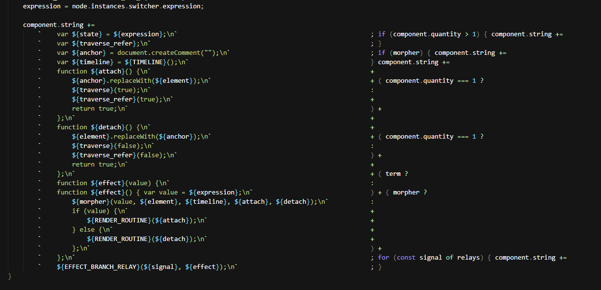 Алсо, месяцев пять мне насоветовали в JSX переписать мою говнину - охуенно получилось. Пришлось свой транспайлер писать на 2к строк, ну ничего, бывает.