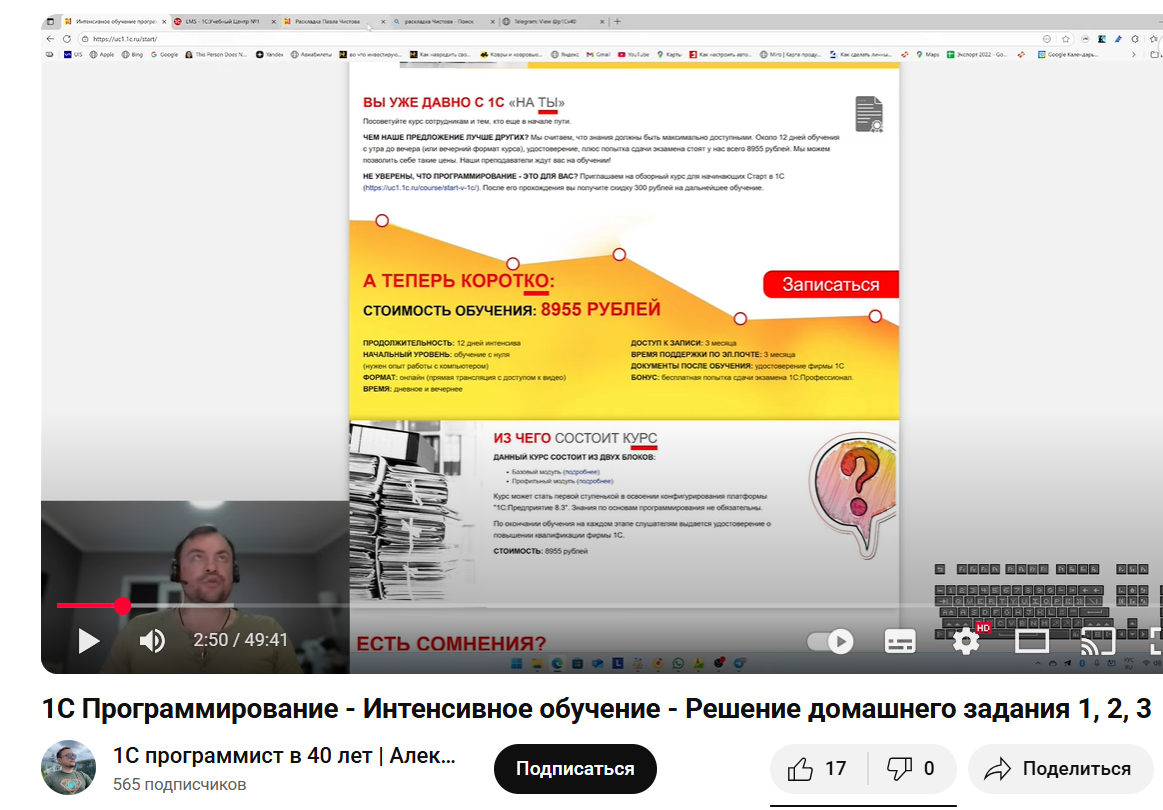 Хорошие курсы по программированию для начинающих http://xn----1-bedvffifm4g.xn--p1ai/ http://курсы-по-1с.рф/. Регаешься на курс, каждый день приходит по 1-му видеоуроку. Смотришь на скорости x4, усваиваешь только самое главное. По "1С: Специалист по платформе" там же хороший курс, но он за деньги. Курс по СКД (система компоновки данных - инструмент разработки отчетов): http://www.spec8.ru/kurs-po-skd-besplatno Описание местного языка запросов: http://programmist1s.ru/yazyik-zaprosa-1s/