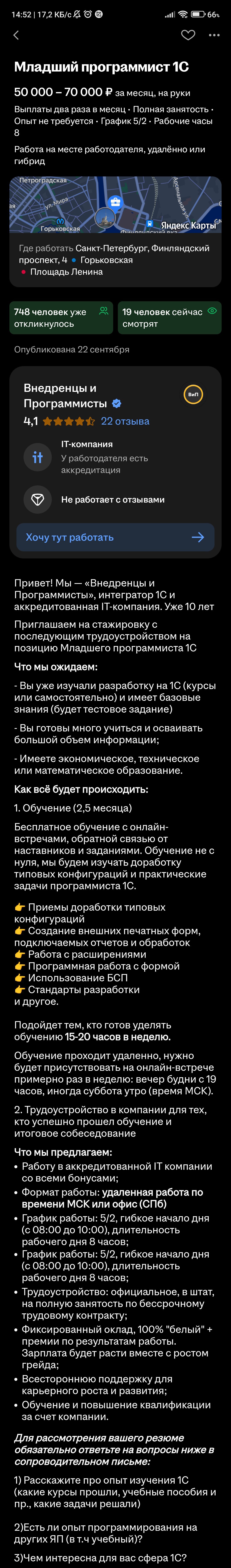 >>3536005 >3000-5000 вакансий что мешает? бота делаешь и вперед. или скрипт какой. а на деле что не так? больше вакансий, больше шанса что возьмут. у меня знакомый откликнулся когда искал работу на 700шт. воронка же, разве нет? >в тиндере проще всего знакомиться, потому что там больше всего женщин от части да. так и есть. > Вакансий golang программеров всего штук 800 их на самом деле больше примерно раза в 2. просто никто на хх не публикует, потому что там найм максимально хуевый. сначала очень тщательно ищут по своим и по партнеркам всяким. или смотрят хх, видят норм кандидата, и ему описание вакансии. >А ты через 10 лет будешь всё также за 100к/месяц небо коптить, потому что тебе влом было рисковать минусы? кто хочет рисковать? 100к это зп джуна в 1с, ты о чем. >>3536106 кстати нахожу забавным, что анон сравнил количество вакансий, и не сравнил саму динамику рабочего процесса. то есть в то время как инженер спокойно окукливается в своем мирке, программист 1с будет общаться и общаться много. хотя конечно разраб 1с разрабу 1с, но вот общался со знакомым, по 14ч созвонов в неделю. и все важные.