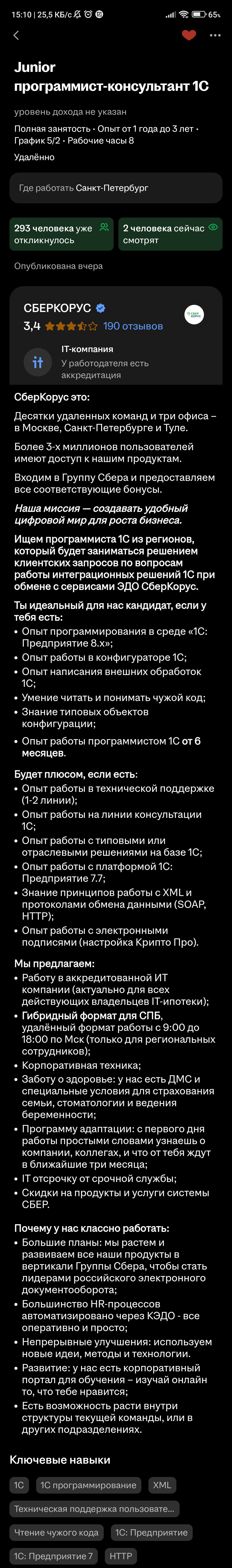 Как-то грустно стало от треда. Какие-то галеры, какие-то накручивания опытов, какие-то оклады в 20к... Повезло заскочить на стажировку в крупный интегратор, теперь меня отсюда только вперёд ногами вынесут. 1С православный люблю-ценю-увожаю.