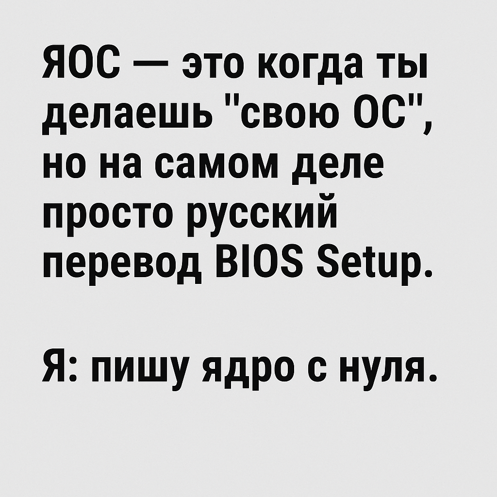 Тут советовали «лучше помогать ЯОС». Ага, только в ЯОС половина на костылях, а у меня всё своё, с нуля челы тупят и пилят заплатки для заплаток. Разница как между клоном «Винды» и реально написанной ОС.