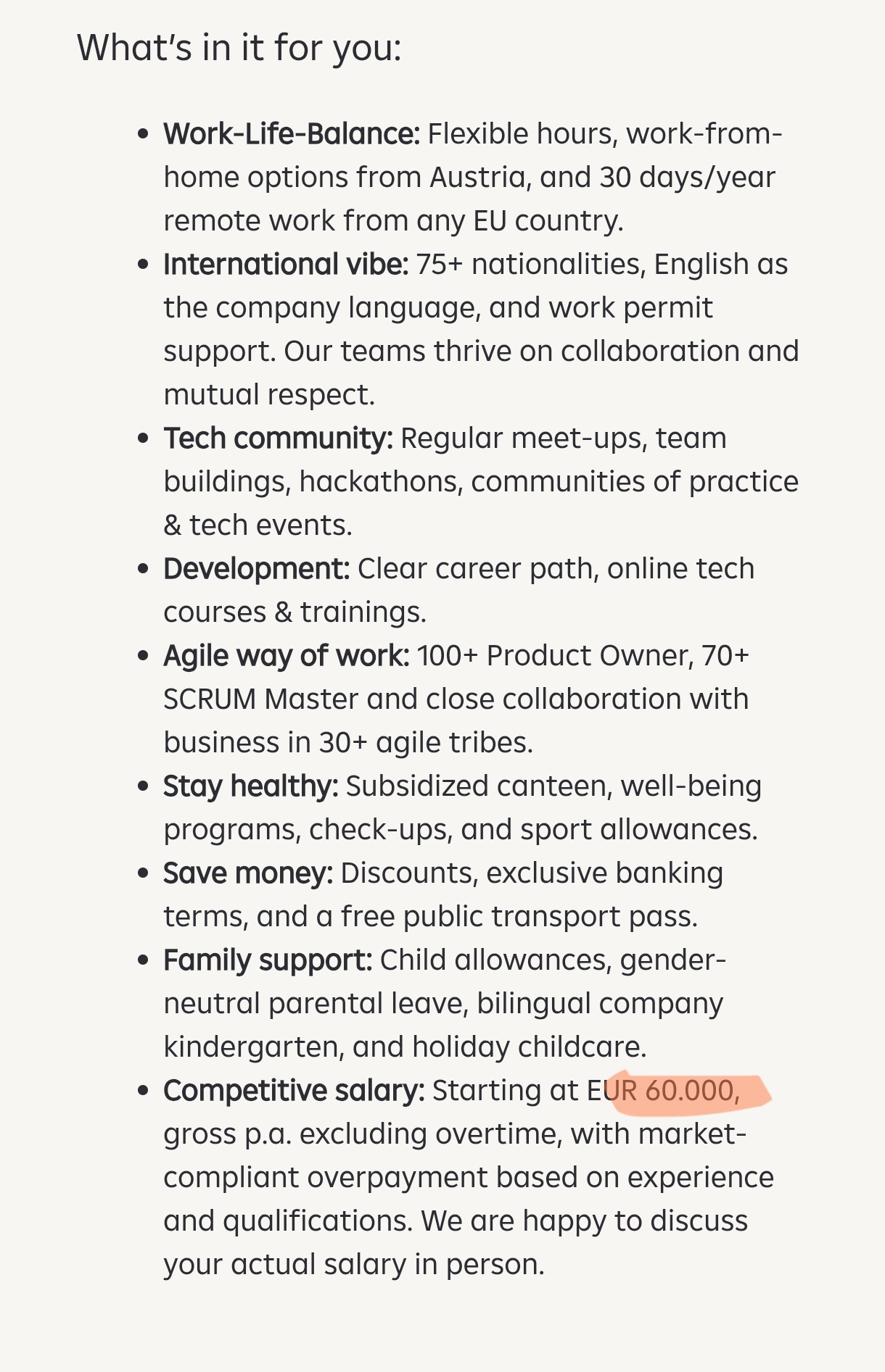 >>3569086 В Вене ? 70к? Это копейки, это копейки даже для нищего арабесного Берлина. Для Вены разговор 100к+ должен идти, плюс компенсации. >>3569109 Ну не скажи, у нас в кодовой базе комменты на русском, предполагается что будет работать русич с кодом... Нормально все.