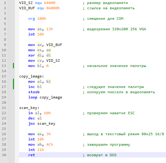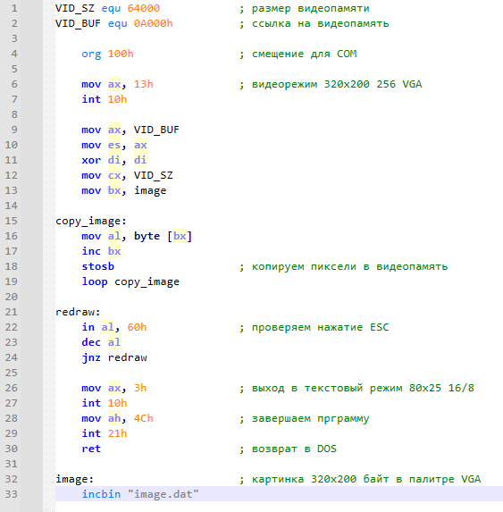 >>3555161 (OP) Как загрузить картинку BMP под ДОС. Читаешь, изучаешь формат файлов BMP. Он не очень сложный. Пишешь парсер, грузишь картинку в память. Главное, чтобы памяти хватило. Там же ограничение реального режима 640 КБ. Но есть ещё и EMS и XMS (кажется так они называются). И вообще можно попробовать переключить процессор в защищённый режим, и заюзать всю доступную память. С этой памятью можно промудохаться как следует.