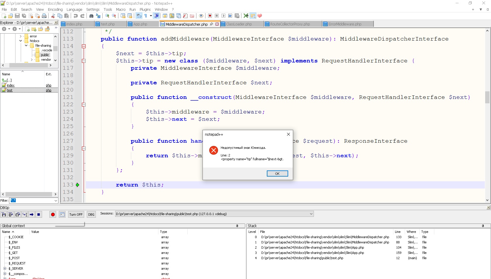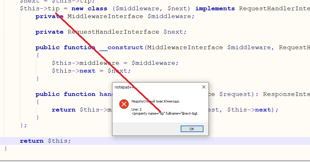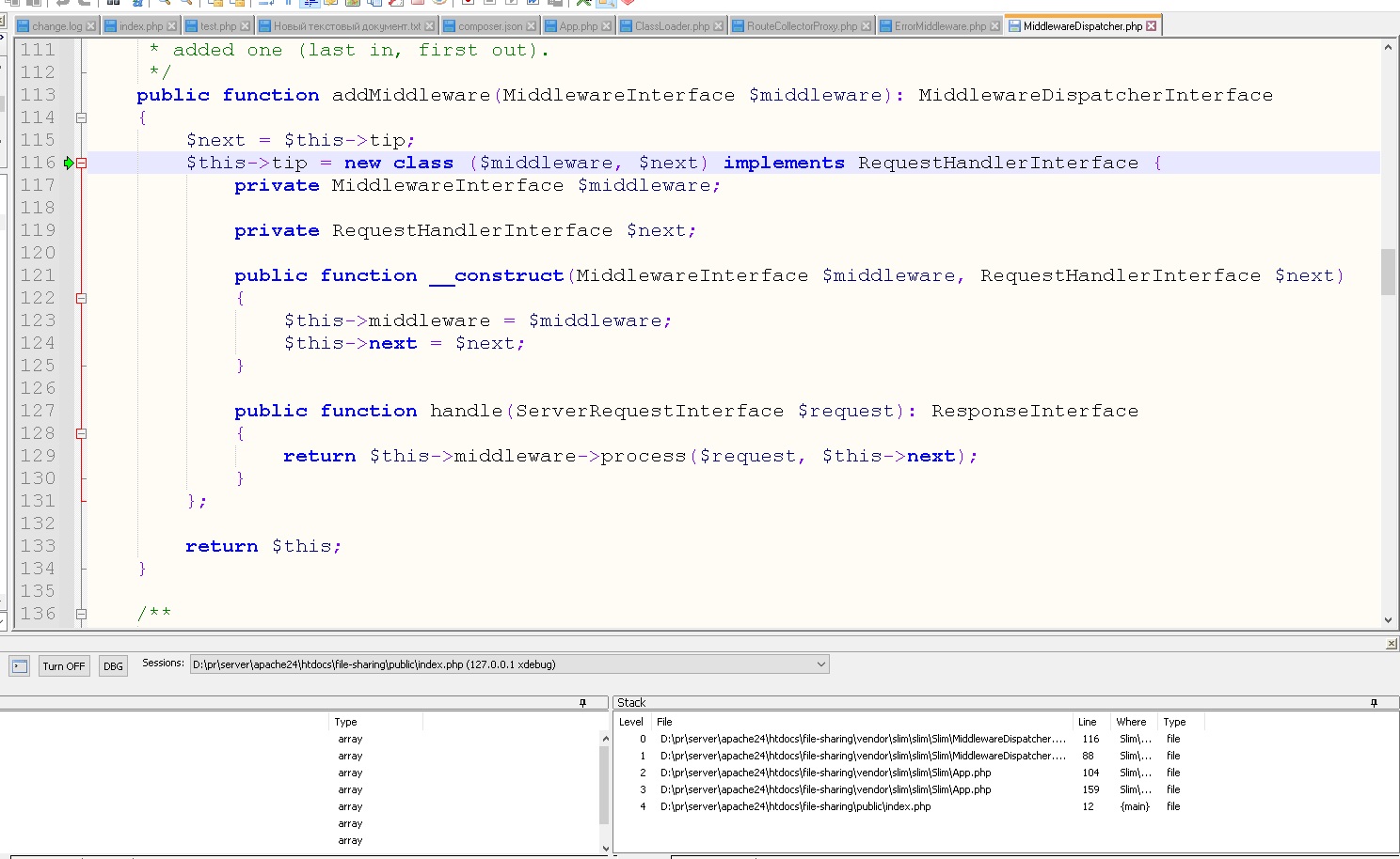 В notepad++ (не спрашивайте) в xdebug ошибка пикрелейтед после этой строки https://github.com/slimphp/Slim/blob/4.x/Slim/MiddlewareDispatcher.php#L116 В логе xdebug по поиску $next-> какой-то внятной информации не нашел, будто бы ошибки и нет вовсе. Так же в vscode все нормально в отладке на этой строке, из чего можно сделать вывод что что-то с notepad++. Куда можно копнуть?