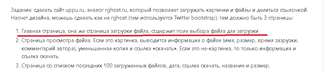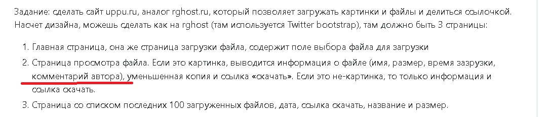 >>3626485 Но загрузка файла описана так: Главная страница, она же страница загрузки файла, содержит поле выбора файла для загрузки Не написано, что нужно поле с комментарием.