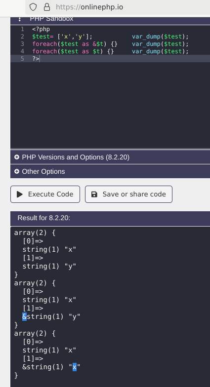 Блин, какой ужас. Надо unset($t) делать каждый раз, чтобы $t не оставался укателем на последний элемент предыдущего цикла с указателем... Неужели кто-то пользуется именно таким поведением php, что его так и не поменяли? https://bugs.php.net/bug.php?id=29992