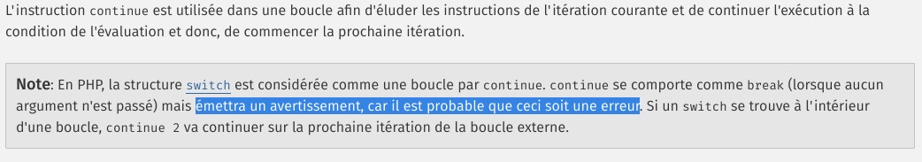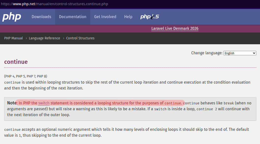 Может мне кто-то объяснить, почему из switch внутри while я должен писать continue 2? Ведь это не цикл в цикле, а проверка условий в цикле. Из if/else ведь continue 2 делать не нужно. Просто потому, что в switch применяется break? Я думал, это синтаксическая формальность... А если два switch, то continue 3, получается? >while() { switch() { switch() { continue ?; } } }