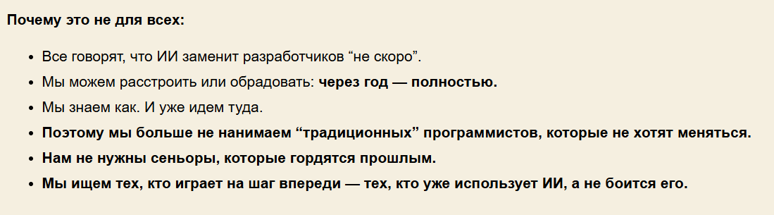 Ну и да, сам по себе найм в России умер из-за слабой экономики и отсутствия выхода на западного кабана. Еще в феврале 2022 года примерно всем более-менее в здравом уме анонам стало понятно, что это был контрольный выстрел в айти, все остальное это уже чисто конвульсии. Здесь вряд ли что-то в обозримом будущем восстановится, никакого ласкового хайра не будет.