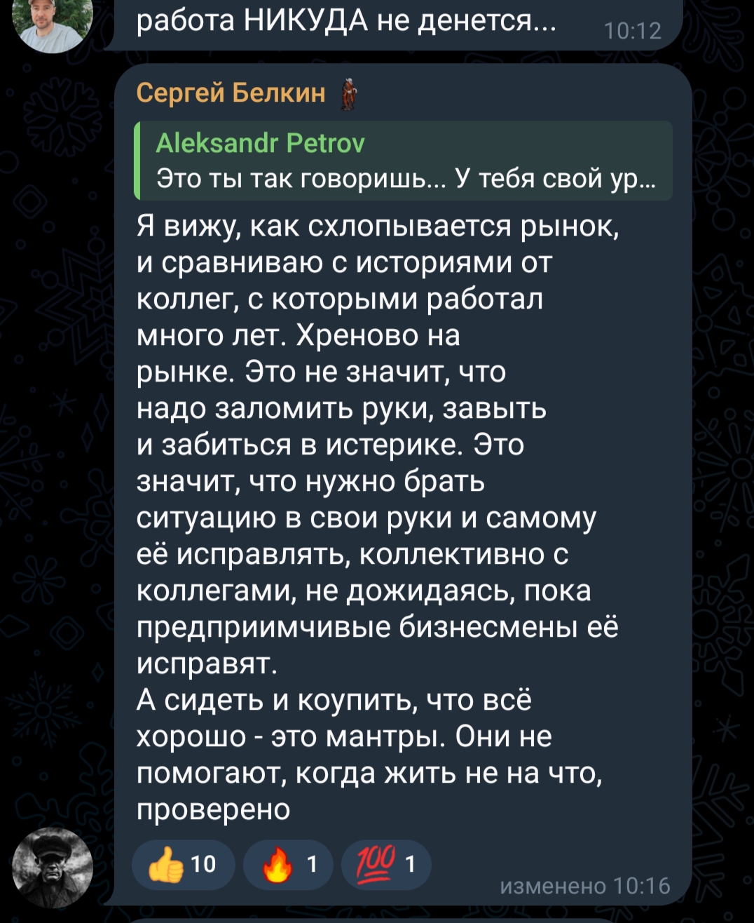 >>3607298 >Я получаю меньше 400к. Естественно, пынсия по шизе раз в 40 меньше. >Сразу видно что ты школьник и не работал в IT. Тащи линкдин свой для начала. >IT - одна из самых стрессовых работ, а анальники через одного - токсичные быдланы. Ну завод и сварка одна из самый лайтовых, а вчерашнее быдло из пту милейшие люди, надо полагать, лол. >>поездок оплачиваемых >какие поездки? куда ты собрался ездить? До ковида куда только не ездили с тимой - ОАЭ, Испания, Италия, Марокко, Китай, даже в штаты один раз так-то, не говоря уже про дс/дс2, и это обычная продуктовая галера меньше 400 рыл в мухосранске. >Шлюхи, бары, рестиики... Мань, проснись, ты обосрался. Это какой-то поток школьного слабоумия уже. При мне барменша сказала, что завидует такой жизни, и что хотела бы оказаться на его месте, когда сеньер на плюсах рассказал эту историю в баре, как их сто вывез в дс на все это непотребство и где он ебал шлюху с месячными лол. Это тебе про реальное отношение к анальникам от простых работяг, ибо получает она нихуя не 400к как он на удаленке, плюс еще работает массажистом ебаным не имея вышки, что-то заводчанинам, таксистам или сварщикам так никто не завидует.