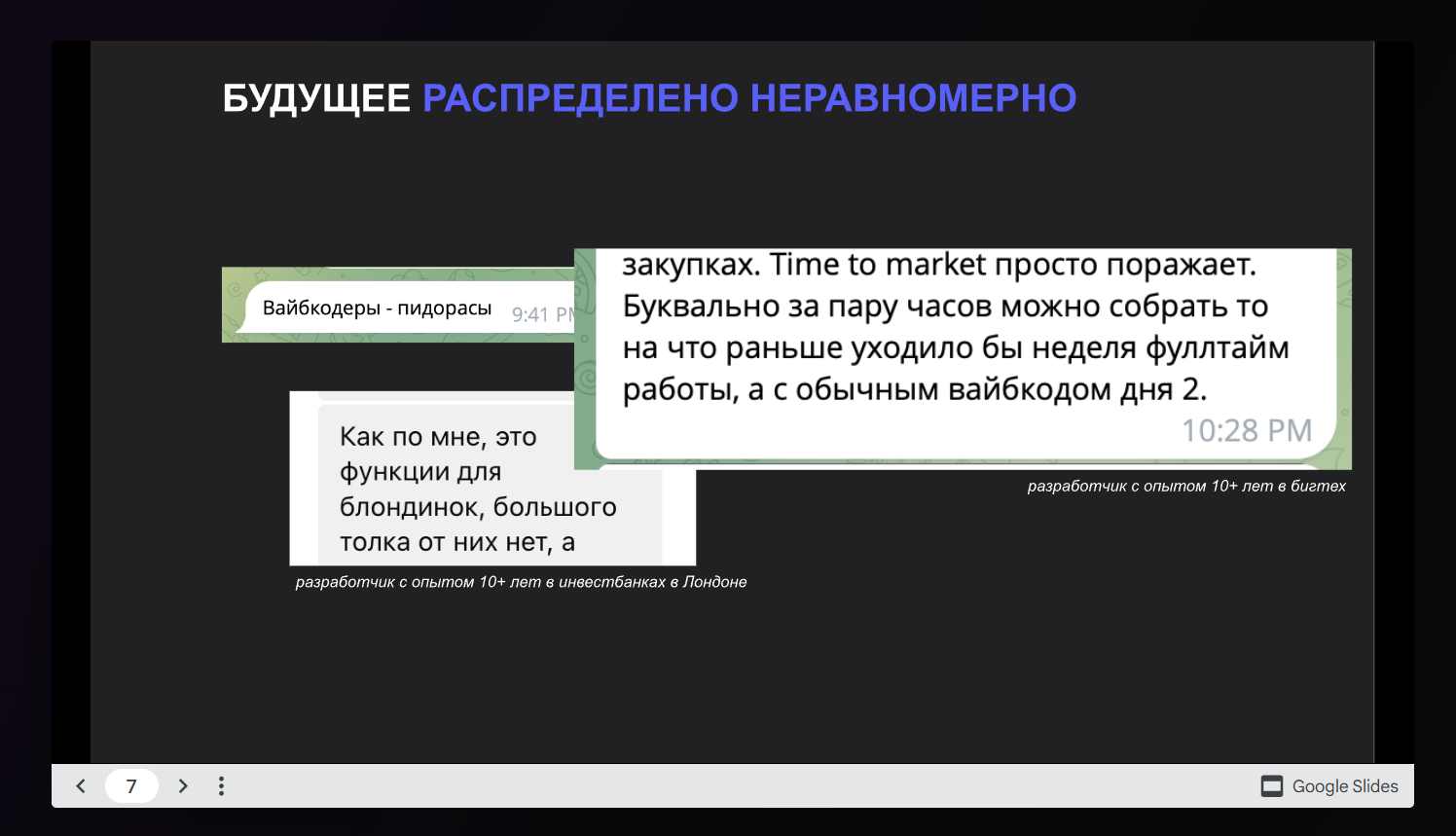 >Ты - типичный чувачок с гипертрофированным чувством собственной важности, которое видит во всех коллегах идиотов, которые клепают сайты-визитки, но только ТЫ самый умный, только ТЫ работал над сложными проектами, а все остальные - так, визитки делают. > При этом ты не инженер, делающий прорывные технологии меняющие мир, ты обезьяна со знанием пары тривиальных языков программирования, в которые сегодня легко вкатываются любые студенты с 11 классами образования.