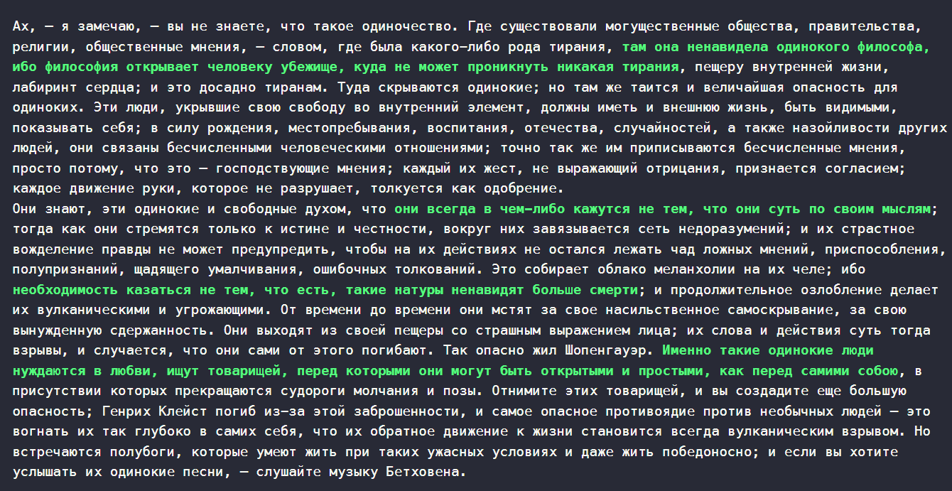 Ах, — я замечаю, — вы не знаете, что такое одиночество. Где существовали могущественные общества, правительства, религии, общественные мнения, — словом, где была какого-либо рода тирания, там она ненавидела одинокого философа, ибо философия открывает человеку убежище, куда не может проникнуть никакая тирания, пещеру внутренней жизни, лабиринт сердца; и это досадно тиранам. Туда скрываются одинокие; но там же таится и величайшая опасность для одиноких. Эти люди, укрывшие свою свободу во внутренний элемент, должны иметь и внешнюю жизнь, быть видимыми, показывать себя; в силу рождения, местопребывания, воспитания, отечества, случайностей, а также назойливости других людей, они связаны бесчисленными человеческими отношениями; точно так же им приписываются бесчисленные мнения, просто потому, что это — господствующие мнения; каждый их жест, не выражающий отрицания, признается согласием; каждое движение руки, которое не разрушает, толкуется как одобрение.