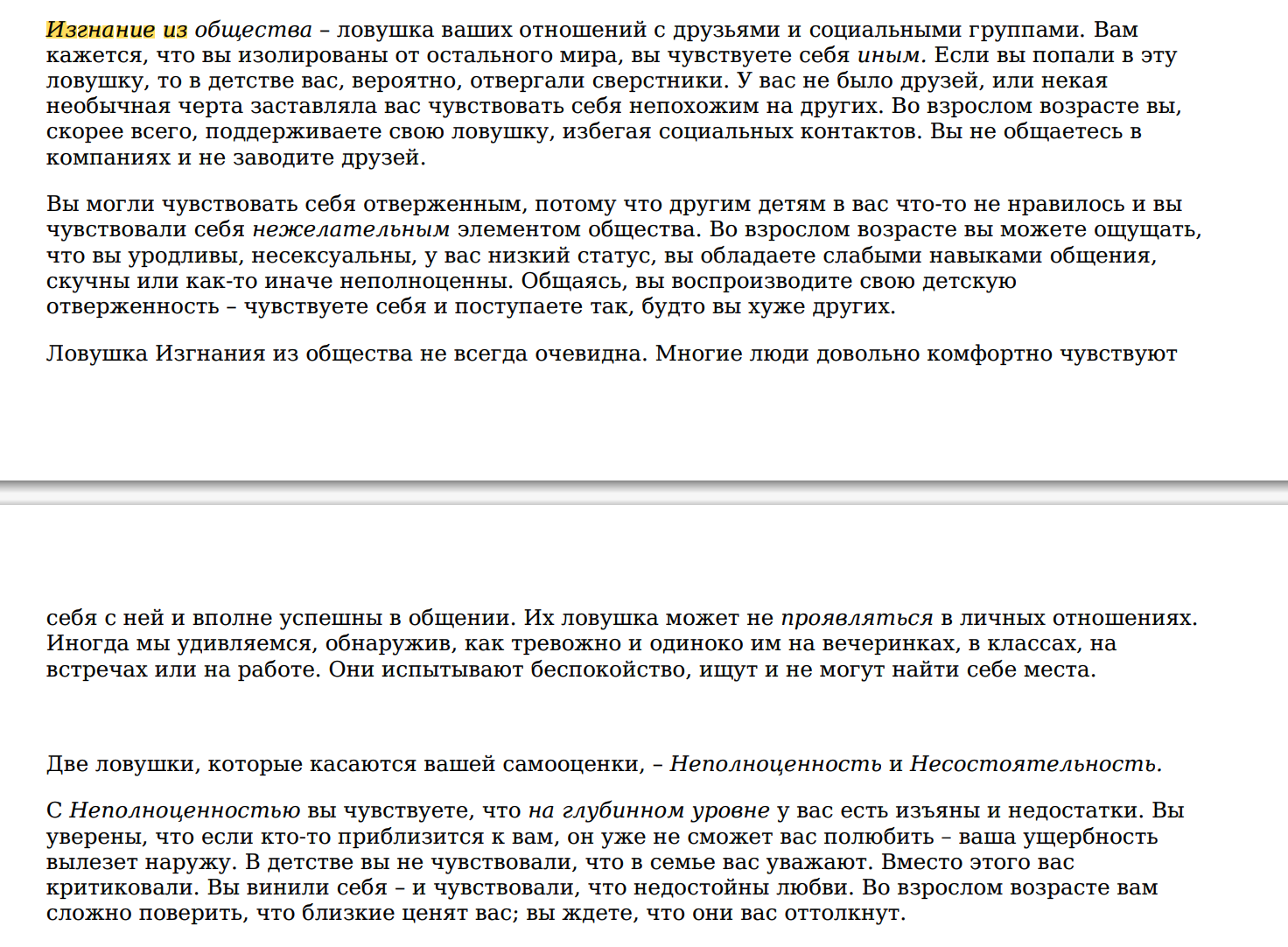 Литература: - Янг Джеффри, Клоско Джанет — Прочь из замкнутого круга! Как оставить проблемы в прошлом и впустить в свою жизнь счастье — книга по схема-терапии. - Гитта Джейкоб, Ханни Ван Гендерен — Разрушение паттернов негативного мышления. - Ричардс Томас — Преодоление социофобии и застенчивости: шаг за шагом — ультрагодный курс преодоления социофобии. - Маккей Мэтью, Брантли Джеффри — Диалектическая поведенческая терапия — книга по DBT. - Хэррис Расс — Ловушка счастья. Перестаем переживать – начинаем жить — книга по ACT. - Штавеманн Гарлих — Самоценность. Как заставить ее работать на себя — годная книга по самооценке. Не относятся к теме напрямую, но рекомендуются к прочтению: - Пит Уокер — кПТСР. Руководство по восстановлению от детской травмы - Дженни Миллер Виктория Ламберт - Личные границы. Как их устанавливать и отстаивать - Лейл Лаундес - Как говорить с кем угодно и о чем угодно - Тед Зефф - Сверхчувствительные люди. От трудностей к преимуществам - Жан-Мишель Кинодо - Приручение одиночества (не обязательно, но будет интересно)