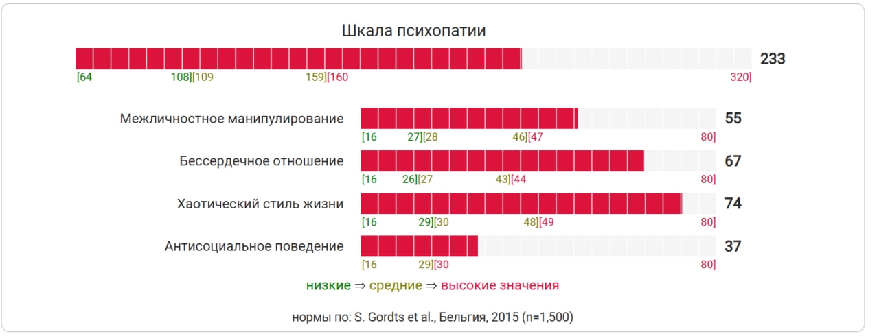 >>1814892 Как я уже говорил, мне не нравится говорить о психопатах как об отдельном типе людей. Опыт моего психа, современной класификации, да и мой в общем говорит скорее о спектре, чем о тех супер-людях из фильмов на вроде Американского Психопата. Домен диссоциальности на то и домен, что смешивается с остальными и выражен по разному. Да и его выраженность может колебаться от отсутствия стыда при лжи и предательстве, до тяжёлых статей.