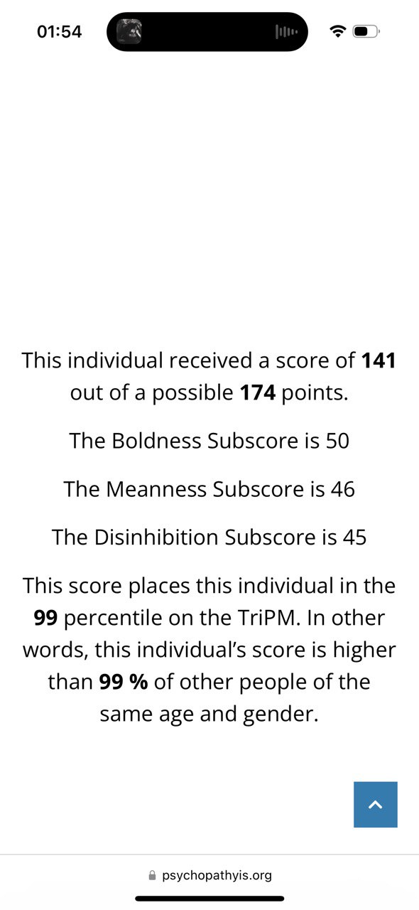 >Вот я и не понял логику автора - если психопат может вести себя в моменте как рациональный человек, контролирующий свое поведение, это не отменяет его органических проблем в мозгу, обуславливающих большую предрасположенность к деструктивному и асоциальному поведению. Препараты же для снижения импульсивности/агрессии/раздражительности просто пытаются купировать один из симптомов, а не решают проблему расстройства. Даже если психопат сам по большей части за счет воли и дисциплины внешне будет порядочным членом общества, то от этого он тоже не перестанет быть психопатом - его мозг и его эмоции не заработают так, как у нормальных. Да, его скорее всего не диагностируют в этом случае, но и откровенно буйных мало кого диагностируют, всем похуй просто.
