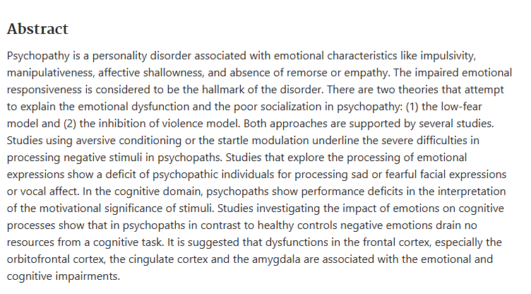 1. Когда психопат проявляет инструментальную агрессию - низкая активность миндалины, высокая активность ОФК 2. Когда психопат проявляет импульсивную эмоциональную агрессию - низкая активность миндалины, низкая активность ОФК (Кстати ОФК это только часть префронтальной коры, так что информация неполная)