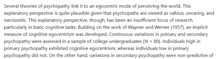 >>1839604 > Вот я и не понял логику автора - если психопат может вести себя в моменте как рациональный человек, контролирующий свое поведение, это не отменяет его органических проблем в мозгу, обуславливающих большую предрасположенность к деструктивному и асоциальному поведению. Препараты же для снижения импульсивности/агрессии/раздражительности просто пытаются купировать один из симптомов, а не решают проблему расстройства. Даже если психопат сам по большей части за счет воли и дисциплины внешне будет порядочным членом общества, то от этого он тоже не перестанет быть психопатом - его мозг и его эмоции не заработают так, как у нормальных. Да, его скорее всего не диагностируют в этом случае, но и откровенно буйных мало кого диагностируют, всем похуй просто. У патов нет органики. Но у них мозг работает несколько иначе. Собственно отличия в работе мозга от большинства людей есть и при ПРЛ. Да и при шизоидности тоже своя специфика имеется. Органика, например, приводит к ухудшению когнитивных функций. Чего у патов не наблюдается.