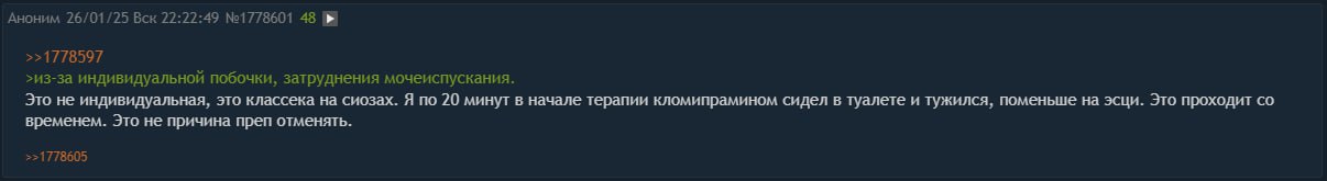 все, мне крышка сиба полностью перестала действовать на 3й день, теперь даже ~40 мг недостаточно, перматолер на всю жизнь видимо, пью 2 месяца и не ощущаю… никогда не брал уличный, он похож по эффекту? на нем тоже вместо дел можно уйти в марафон фапа? дайте совет, парни, не могу заставить себя устроиться на работу, даже тца не помогли, тети лиры тоже нет, как стану наносеком свожу весь тред на водохранилище, сварю бидон самогона, будем есть шашлыки и веселиться! еще случайно выпил его с золофтом и через полчаса отрубился на 12 часов с сильнейшей головной болью, будто пригожин ударил кувалдой