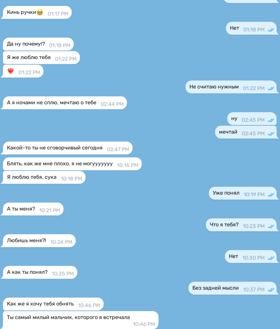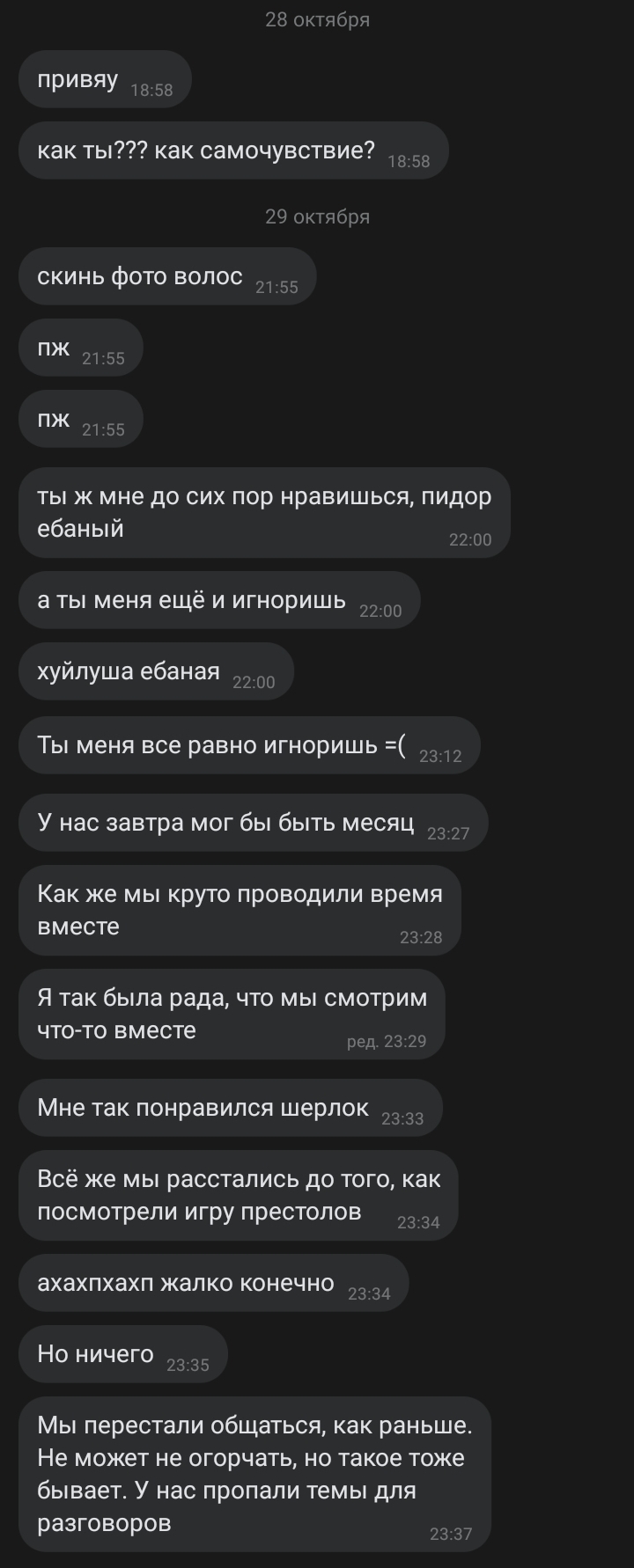 > Один хуй решиться что-то им написать самому не могу А что писать? Тебя за любое задоксят, засплетничают, засмеют. "Привет" - банально. "Как твой день, о ангел ночи" - ты кто. "Давай познакомимся" - ты что, изврат.