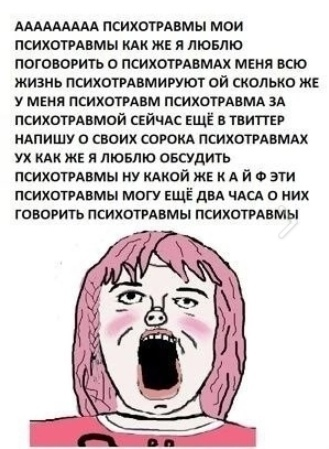 Какие психотравмы, мы с детства ущербы, ещё и уроды, ещё и нищие. Ни один ещё не накалякал, что до 13 или до 15лвл был адекватом, а потом ёбнулся