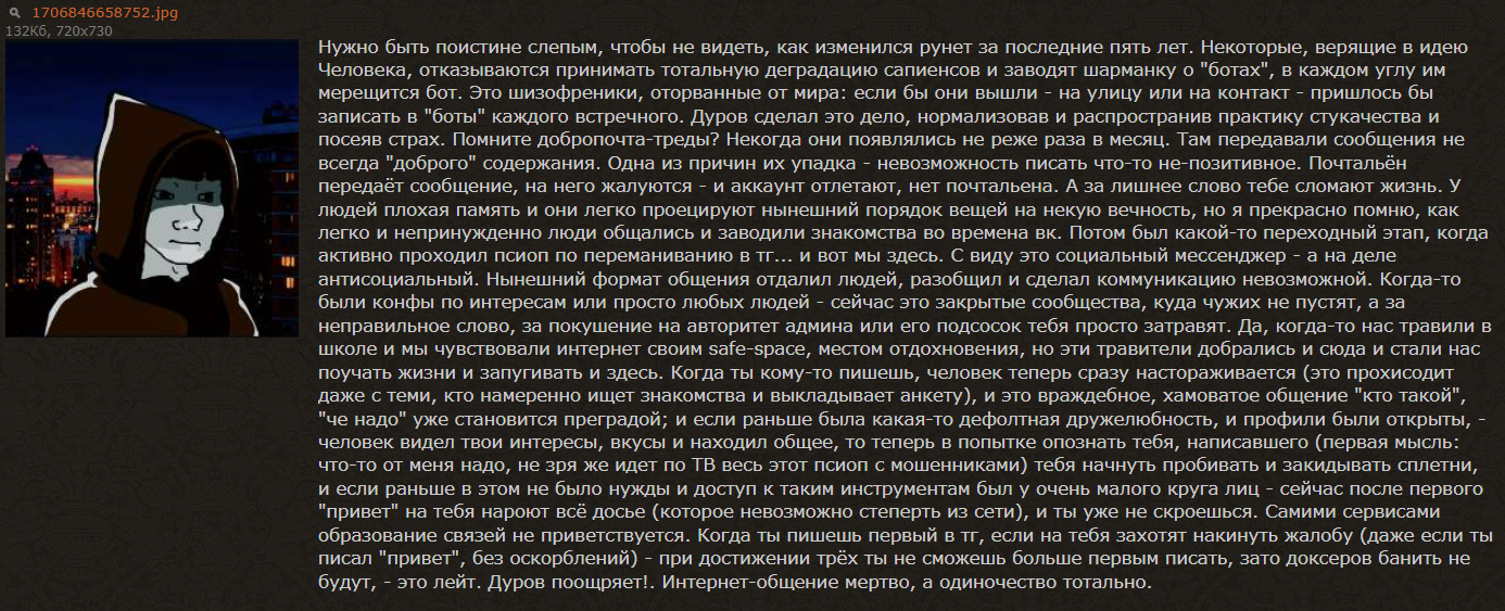 А нахуй нужно общество? С кем собрался коммуницировать? Неужели до сих пор есть ожидания на счёт людей? Или до сих пор питаешь надежды на своё восхождение, как в сладких мечтах где спасаешь класс от террористов и ЕОТ после робуо признаётся в любви, а все мальчуганы жмут тебе руку? Впрочем, не отвечай, я просто пьян.