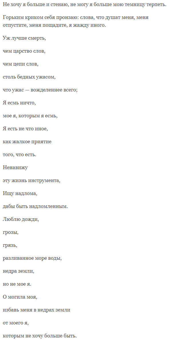 Так что поиски в искусстве и культуре довольно тщетны (потому что это в некоторой мере - предание инстинктов, своей природы). Труды "тёмных авторов" (включая художку вроде Лавкрафта) для нас (для чувства ненависти к себе) слишком безличны, и там "ненависть" захватывает всё человечество.