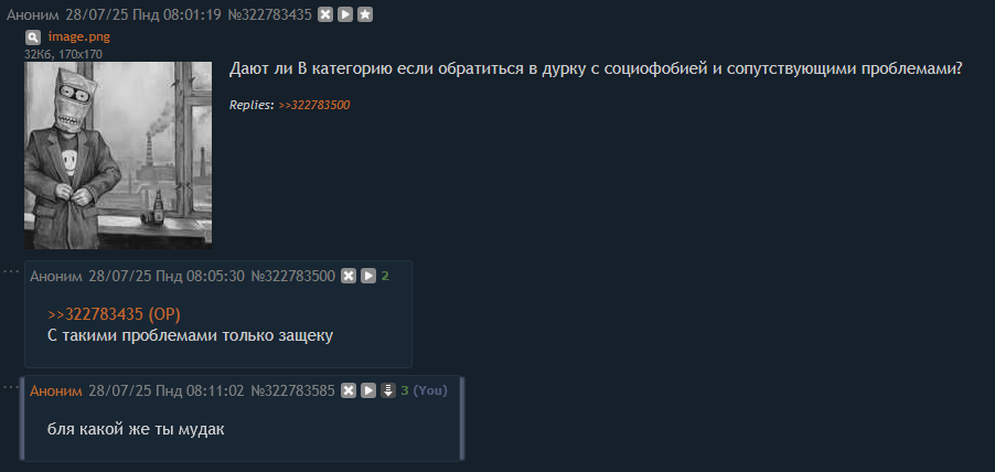 >>1866661 Дебил, не дадут тебе В категорию с твоей хуйней. Для психуятров твоя социофобия это чисто пукиш, пропишут золофт и все, нахуй пойдешь. Скока можно уже эту хуйню спрашивать, какой же ты ебнутый поридж бля