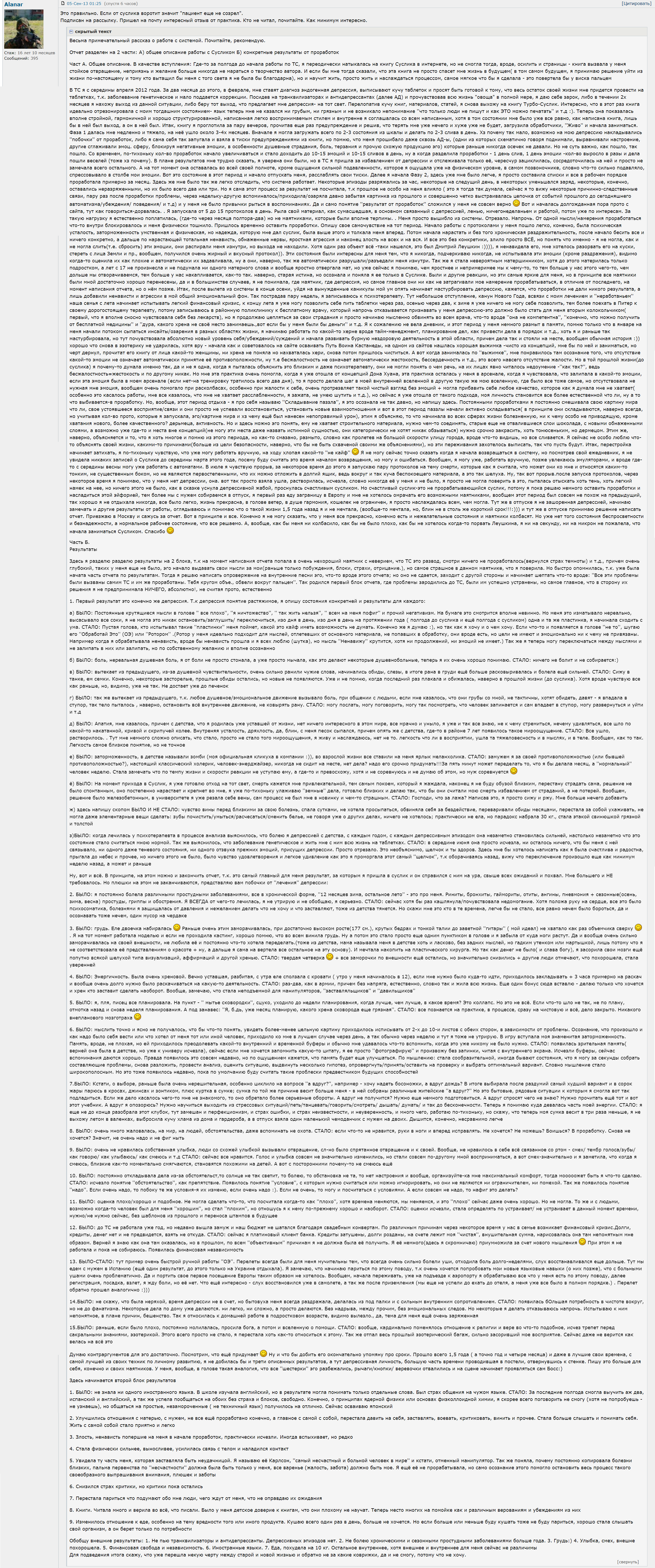 В следующий раз на несколько занятий ходил к женщине, которая подробнее распросила меня о жалобах и задала читать книгу по КПТ. Я понемногу читал книгу и приходил к ней, но суть приема всегда сводилась к вопросу ко мне "У вас есть вопросы по книге?". Мы обсуждали несколько вопросов, после чего я чувствовал, что она хочет, чтобы я скорее ушел, т.к. никакой инициативы в диалоге она не проявляла, а также в целом была какой-то высокомерной и немного резкой.