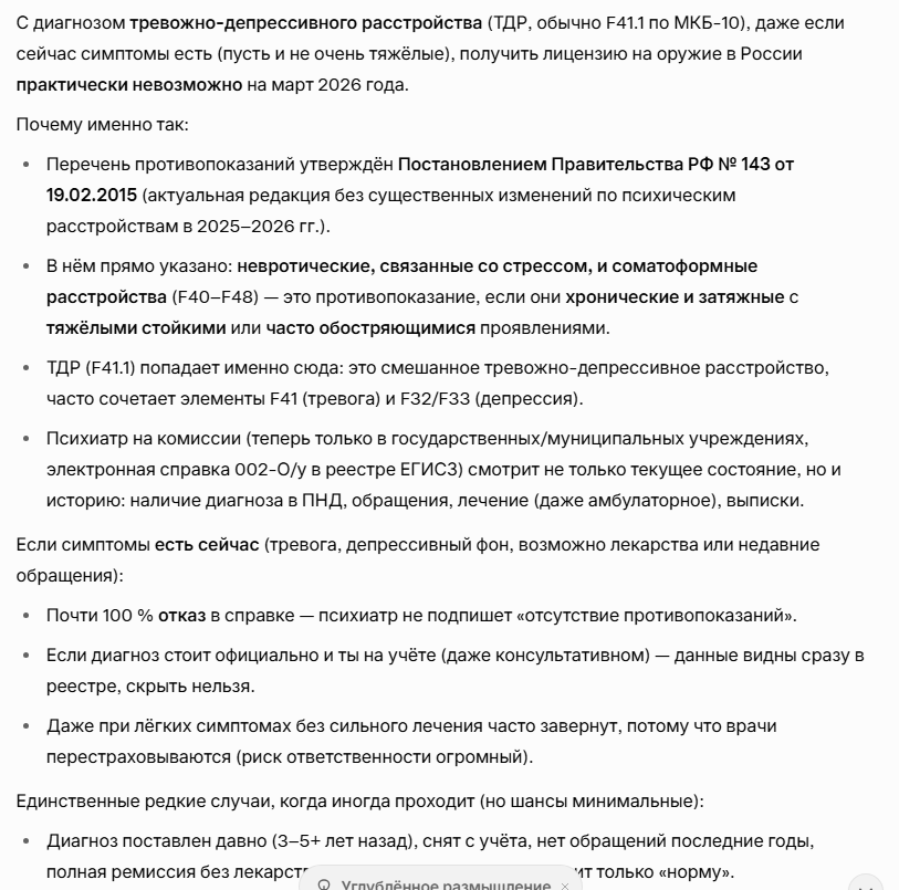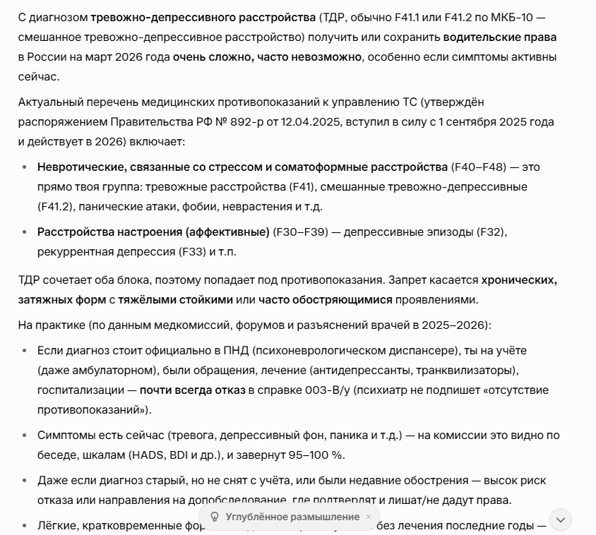 >По твоему описанию (ТДР больше 15 лет, очень тяжёлая форма последние 3 лет, хроническое течение, вероятно, с резистентностью к лечению, сильным влиянием на жизнь — учёба, социализация, возможно, полная дезадаптация) — да, это объективно тянет на пункт «а» статьи 17 Расписания болезней, который даёт категорию Д («не годен» полностью, снятие с воинского учёта). Пойду сдаваться в дурку, может хоть пенсию дадут.