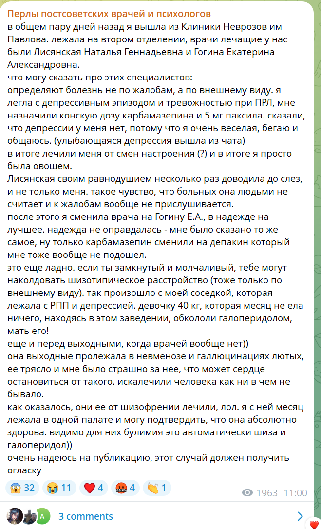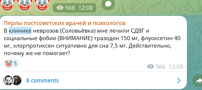 >>1901855 >>1901867 Я про клинику неврозов (какую-то) слышал от анона на медаче, что его туда отправил невролог, и там ему какие-то сложные процедуры делали с мозгом (ну как всегда в неврологи что-то там связанное с током и эл.маг волнами) и капельницы якобы понтовые ставили, ездил он туда с резистентной хронической бессонницей, а когда вернулся, она его больше не беспокоила... Но факт в том что с психиатрией там вообще ничего общего, это чисто неврология была, хз где это.