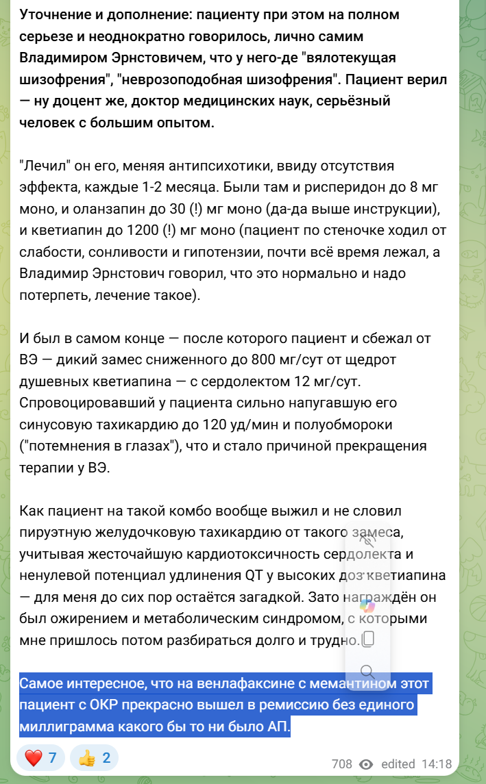 Чо такой тред дохлый? Вылечились все? Помогли тут кому-нибудь антидепрессанты при ОКР? Я тут выше писал, что у меня сыну выписали флувоксамин, сам я очень скептически к этой хуйне отношусь, ну к ад в целом, но чото про него почитал, пишут что действие не в захвате серотонина, а в влиянии на Н1-Н2 рецепторы мелатониновые. Ну кароче разрешил жене их сыну давать, но что это плацебо с побочками мысль не отпускает, с которыми только ухудшу сыну жизнь, тремор ещё какой-нибудь появится.