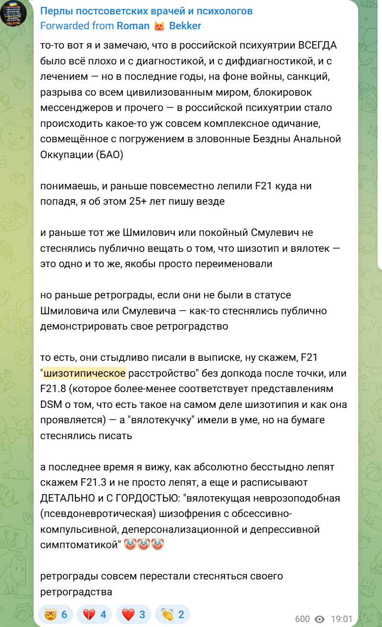 СНОВА ПИЗДЕЖ. Снежневский не занимался дроблением. Наоборот укрупнением и объединением. Его психуяторы брали то, что в других странах считалось отдельными расстройствами (неврозы, расстройства личности, аффективные расстройства), и объявляли это проявлениями единого шизофренического процесса. Раздробила позже как раз докмедецина