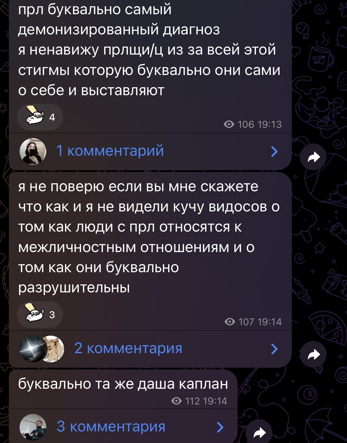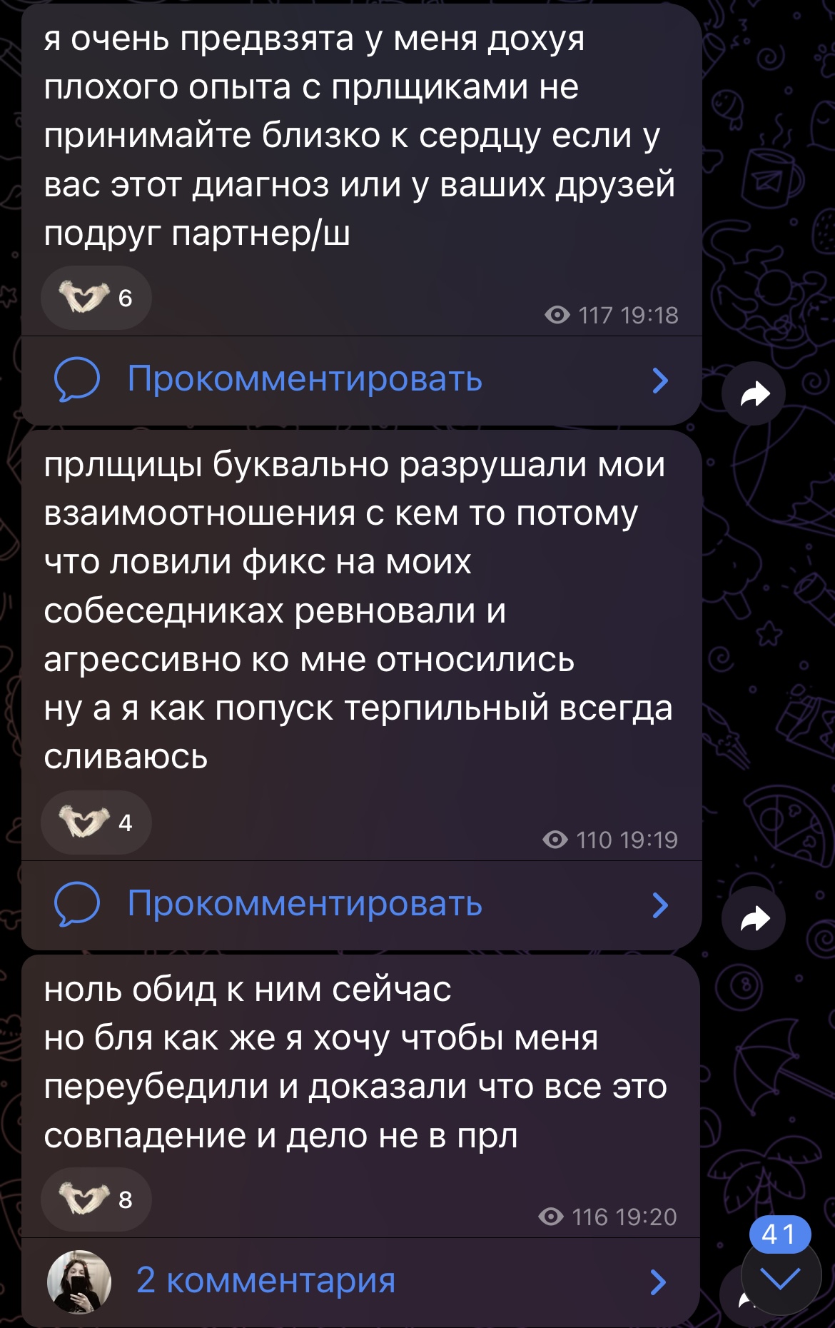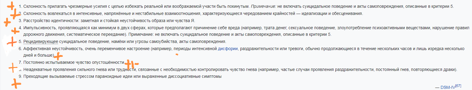 Как сказал доктер, на ПРЛ указывает расщеп приличный, в целом мыслю дихотомиями по отношению к себе, к другим - меньше. страх одиночества, ощущение пустоты и сложности с определением своего я, сдавал ЭПО. Так что вроде можно поверить. А так почти семь лет с реккурентной депрой, дистимией, че там ещё ставили, ГТР + ДРЛ, с дурки в целом с тревожно-депрессивным вышел