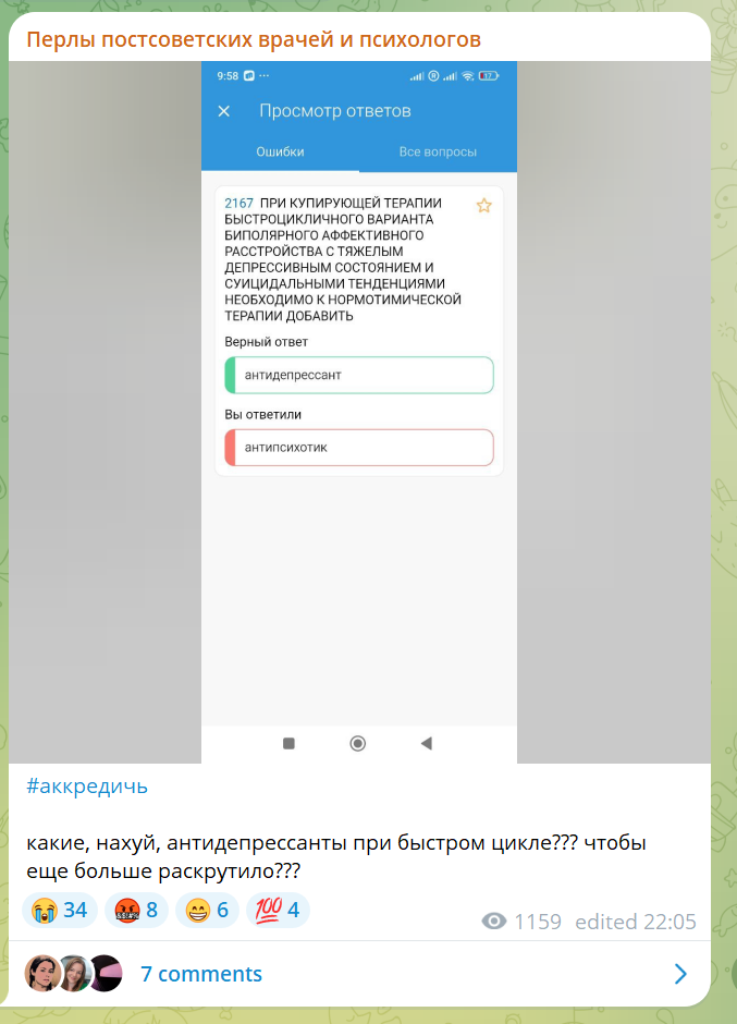 Был на приёме в ПНД. Диагноз у меня уже стоит ( шар) Грач сказал , что мне надо на сво, раз я жить не хочу. Начал предъявлять что я не воспитанный,( голову сконяял на бок) спать хотелось что пиздец, вообще не врубил где я и кто я. В итоге выписал мне карбамазепин на скорую рук, потому что его там позвали куда то бумажки заполнить, при этом сам запутался в дозировках, сначала сказал три таблетки потом 2 в итоге в конце вообще сказал перед сном одну. ПИЗДЕЦ просто, это адекватно? Они все такие ебанутые?
