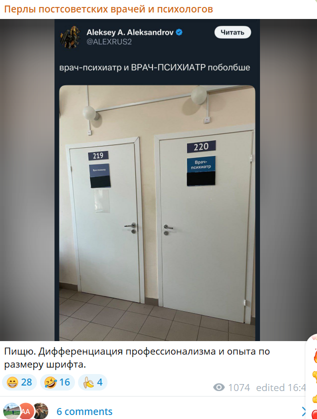 >>1856369 >Ну как бы это очевидные вещи, не? Не >в кабинете с зарешеченным окном Был у нескольких психиатров, в пнд и у частных. Везде окна без решёток, но возможно в отделениях где в острой фазе лежат они есть. Ни один из врачей не был похож на "ненормального". Из всех похожих на ненормального сталкивался только в комиссии при медосмотре для получения в/у. >выписывая по алгоритму таблетки Предлагаешь выписывать их без алгоритма? Ты или никогда не был у психиатра, или тебе просто не повезло оказаться в комнате с зарешеченным окном и дурным врачом, такое вполне возможно, но так не везде.
