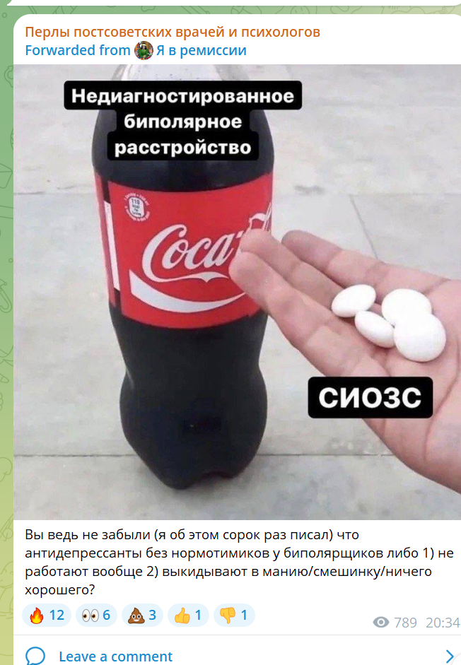 Из за этого и накручиваю себе что у меня БАР потому что многие описывают, как на нопматимиках им становится слишком нормально. Я когда читаю симптомы и пиздец в любом треде, тут же примеряю его на себя, в духе "Бля у меня тоже такое было. Надо СРОЧНО ИДТИ К ПСИХИАТОРУ И ДРОЧИТЬ ЕГО". Я так раньше по другим болячкам любил ходить, а теперь у меня вечная потребность в том, чтобы доктор сказал что со мной все в порядке и я не ебнусь.