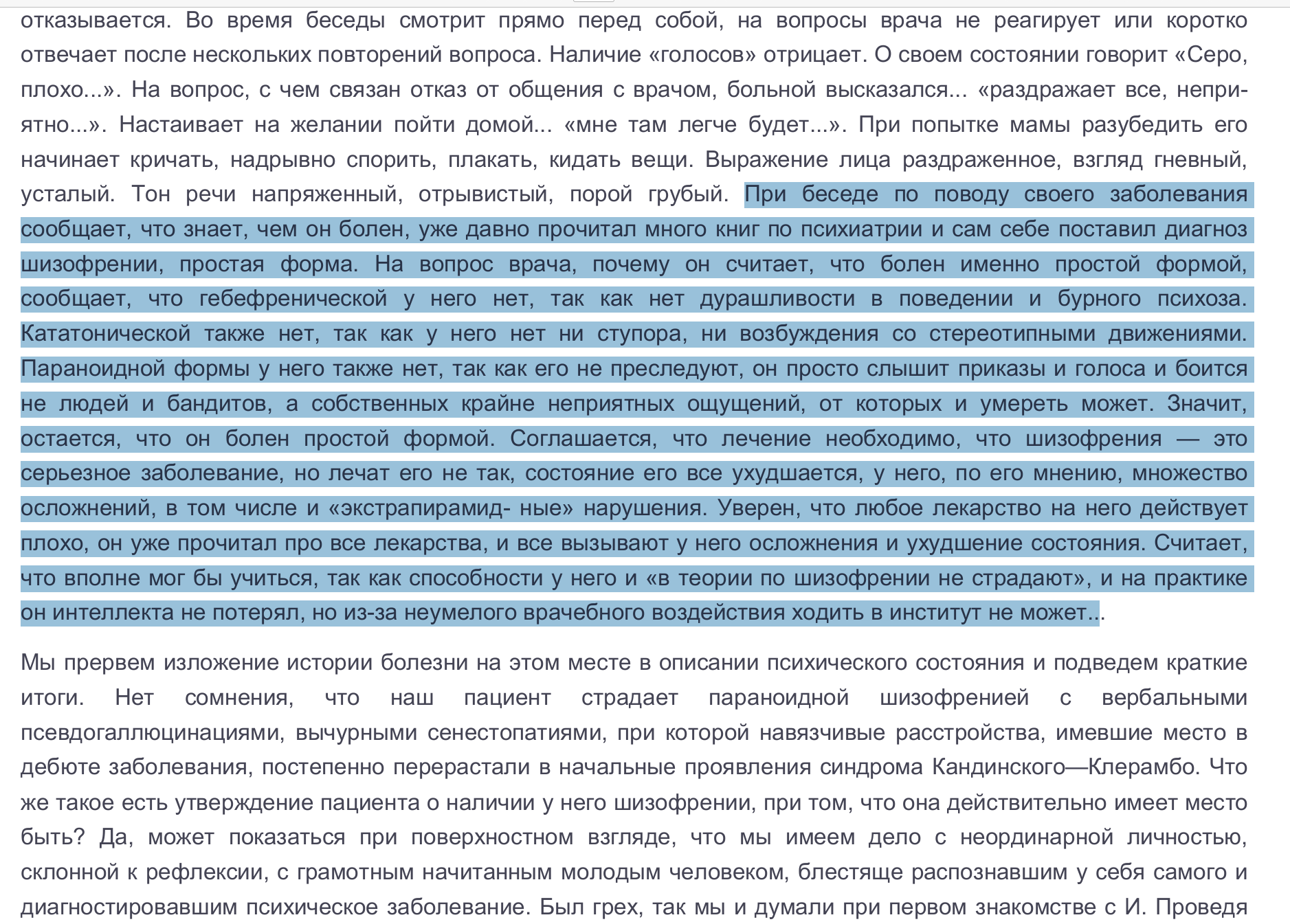 Например я помню, как врач говорил мне что шизофреник не может знать пока он шизофреник пока ему не сказали. И это меня успокоило. А потом что я вижу? Медецинский разбор случая где шизофреник не только сказал, что он шизофреник но и СФОРМИРОВАЛ БРЕД ОБ ЭТОМ. Я не спал после этого случая где-то три дня, пока не обратился к психу и не принёс медкарту, говоря что-то в духе "вот видите, я приношу вам медкарту абсурдного случая... который случился один раз за все 100500 лет... не значит ли это что я ищу валидацию своего бреда? Ведь я же как нормальный человек не мог спокойно посидеть дома, и не думтать об этом. Нет! Мне надо поднять эту тему."