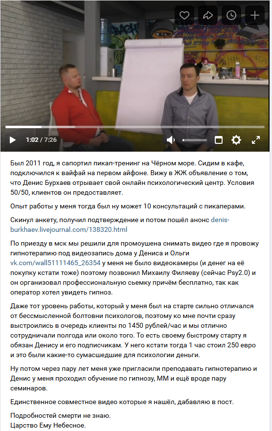 Всем привет! Только что прослушал в ВК получасовой ролик Дениса Бурхаева "О теневой личности". Какой же он всё-таки охуенный! В смысле ролик. Да и Бурхаев тоже. Нет, ну кроме шуток. После этого ролика я понял, каким же всё-таки грамотным психологом был Бурхаев. Вся эта его шизотерика и клоунада - не более чем приманка для привлечения внимания, но психтером он был очень прошаренным. Да и педагог из него нехуйственный бы вышел. Такие сложные вещи объяснять таким простым языком, ну это надо дар от Бога иметь. Всё-таки не зря человек в аспирантуре учился и в самом универе преподавал. Педагогические задатки у него были, кроме того он их правильно развил и применил в своём инфобизнесе. Так просто объяснить такому тупому быдлану, как я, такие вещи как СУПЕРЭГО, ЭГО и ИД, используя понятные обывателям метафоры - ну это просто браво! Как говорится "если ты не можешь объяснить какую-то вещь 5-летнему ребёнку, значит ты сам её особо не понимаешь". А Бурхаев понимал, я щас про психологию. И занимался абсолютно своим делом